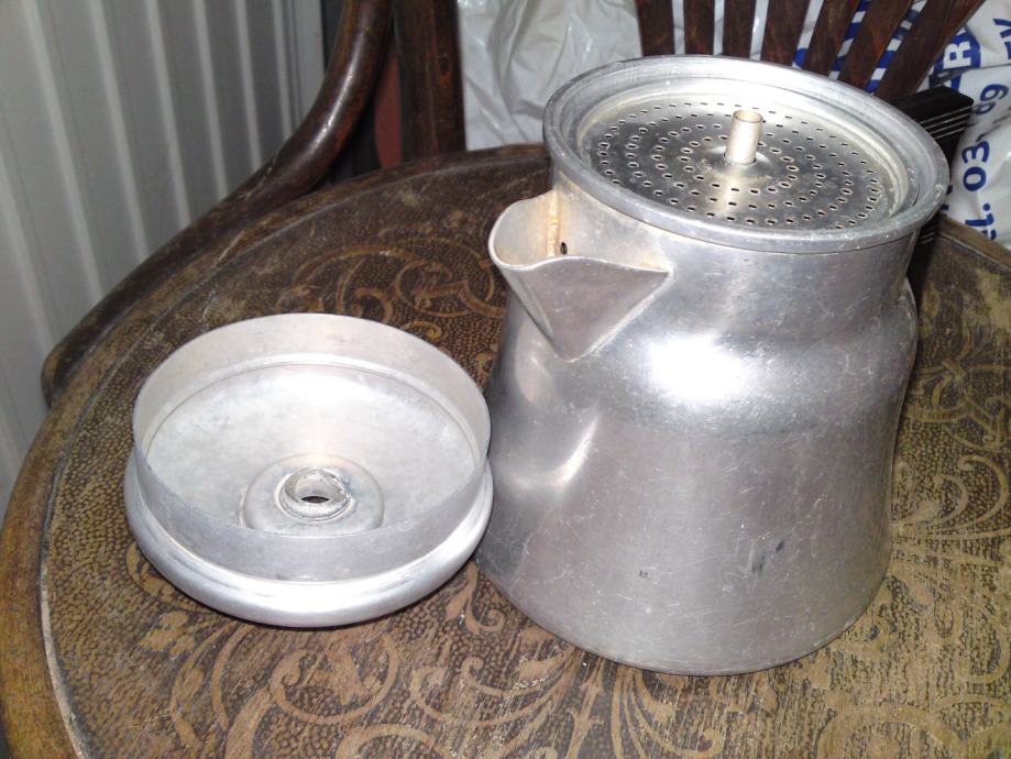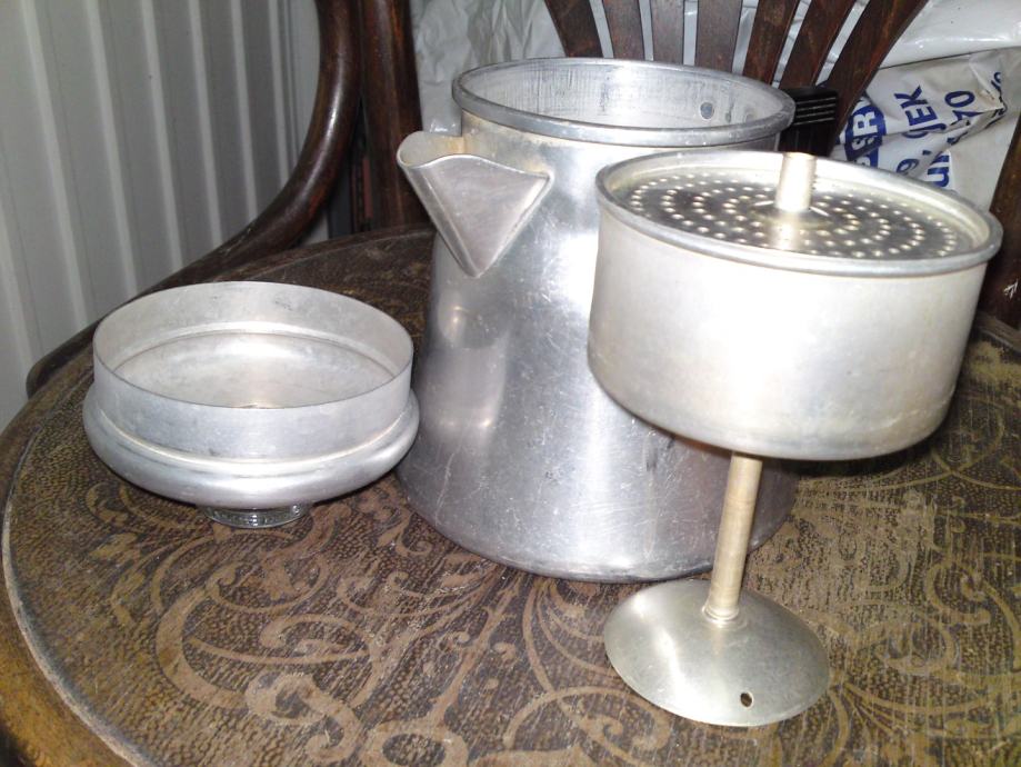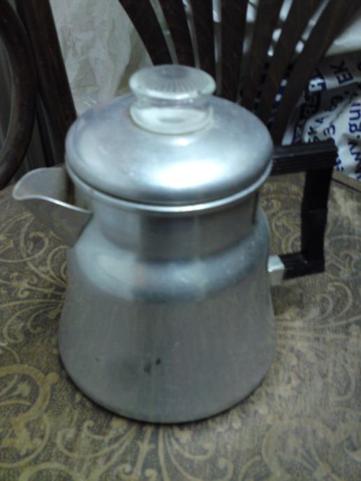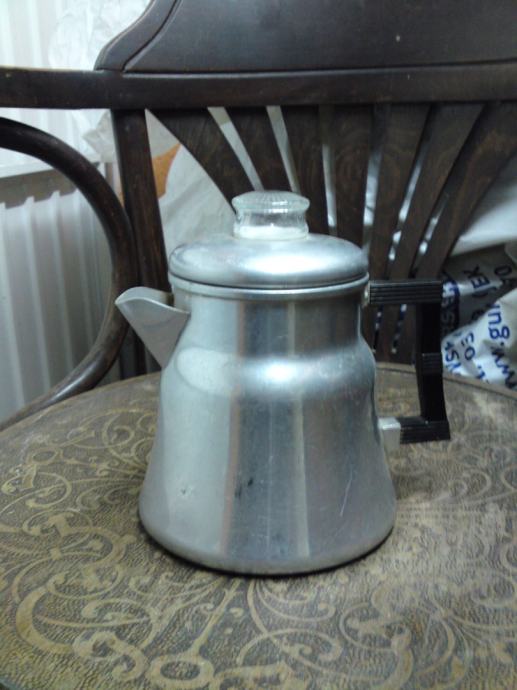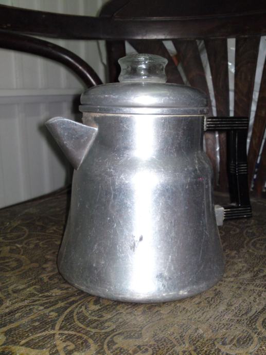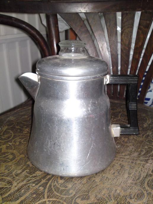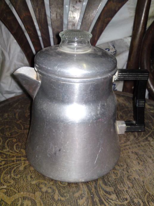 Stari caffe aparat, aluminij, podrijetlo: SAD; proizvođać: Wear Ever, u odličnom stanju; visina - bez poklopca: 15,5 cm; visina sa poklopcem: 20,5 cm; promjer stope: 16,0 cm.