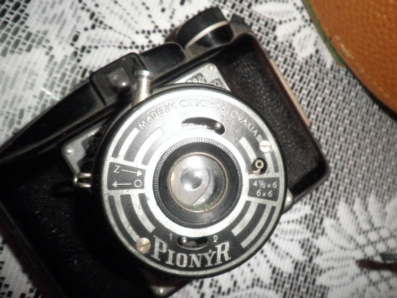 Veoma stari, ispravni čehoslovački fotoaparat, marke " PIONYR " atraktivnog i neobičnog izgleda, sa kožnom torbicom i bakelitnog kućišta ...