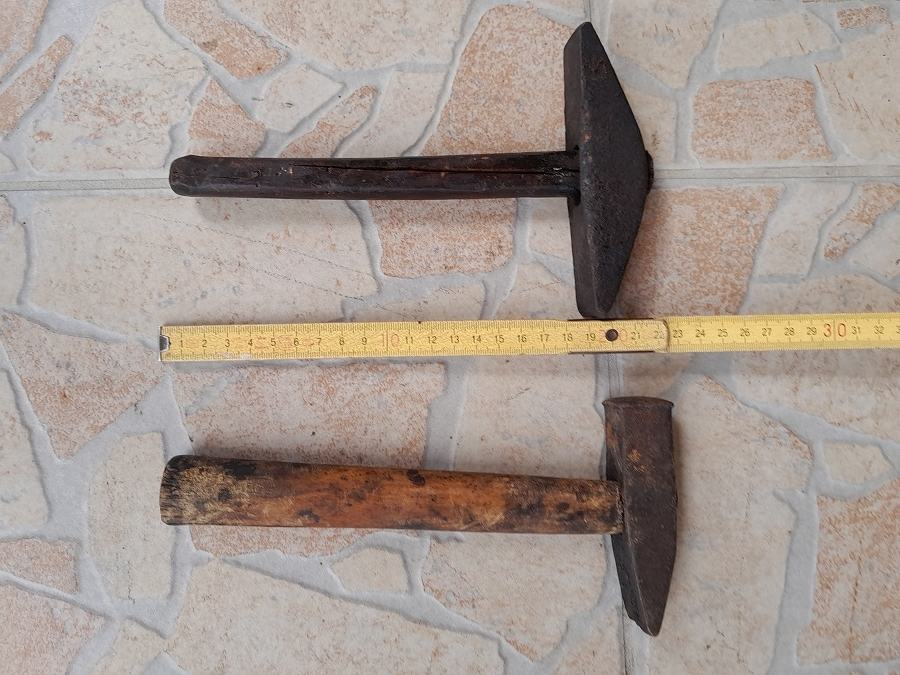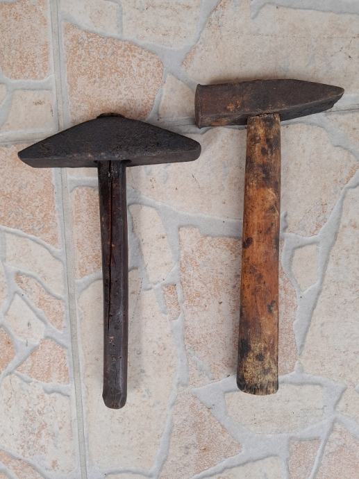 Prodajem dva stara čekića,jedan za klepanje kose,drugi stolarski,stanje kao na slici,šaljem pouzećem na trošak kupca,cijena je za obadva u kompletu 10 eura,pojedinačno 8 eura