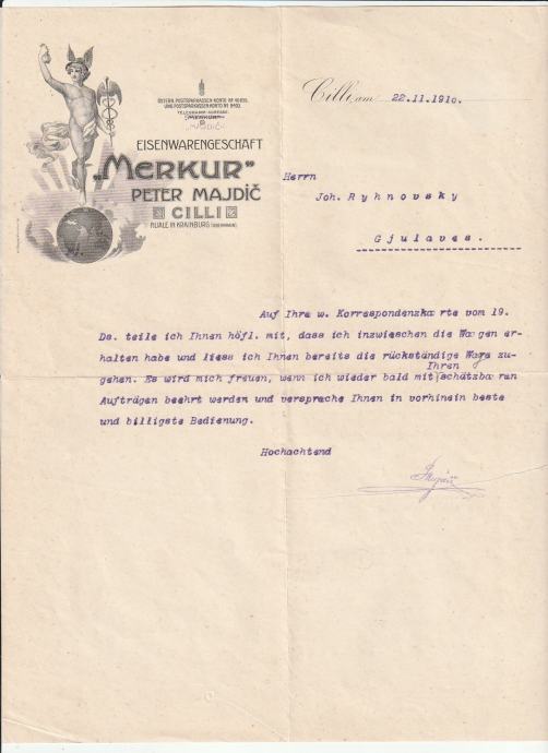 STARI DOKUMENT "MERKUR"PETERA MAJDIČA FILIJALA U KRAINBURGU 1910 g