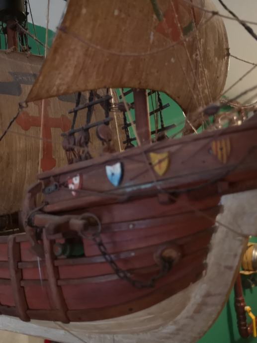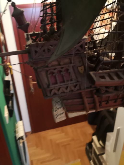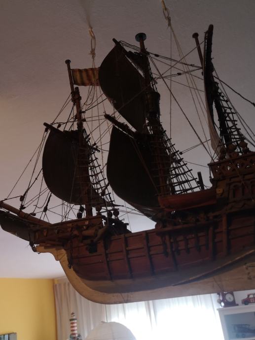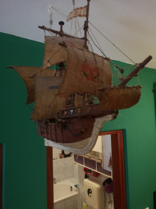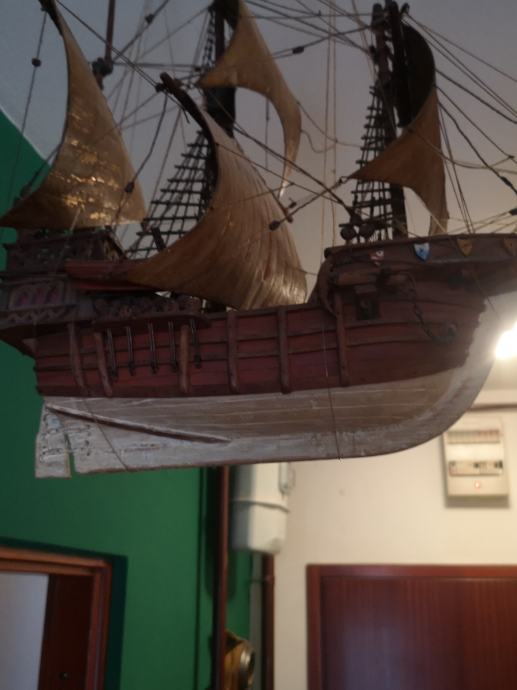 Drveni jedrenjak, ručni rad, sa puno detalja. Ima svoje metalno postolje, a trenutno visi na kukama. Po potrebi mogu poslati još fotografija. Dimenzije d 60 x v ( bez postolja) 45 x š 35 cm. Ne šaljem pouzećem, a preporuča se osobno preuzimanje.
