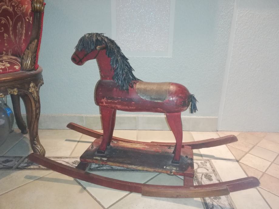 Stari drveni konjić za njihanje, iz privatne kolekcije, sačuvano. Dimenzije visina: 58.5 cm, dužina skija: 88,0 cm, širina skija : 35,5 c m. Visina samog konjića 51,0 cm, širina : 49,0 cm.