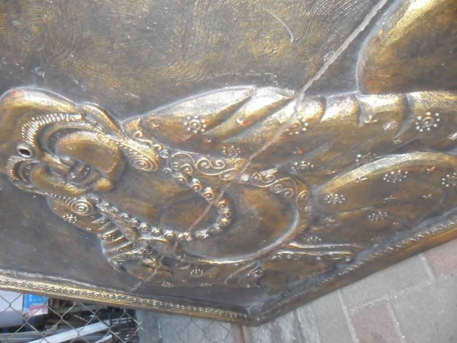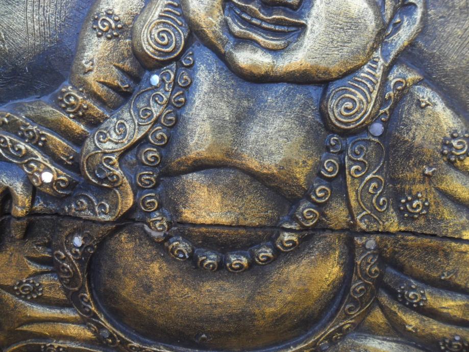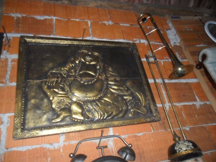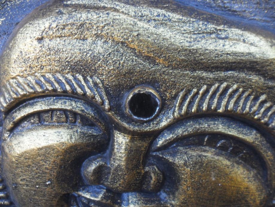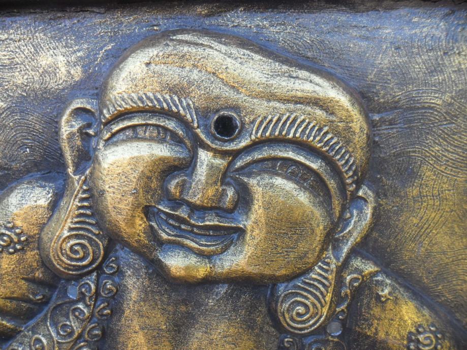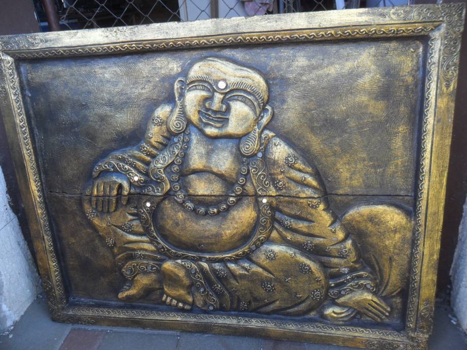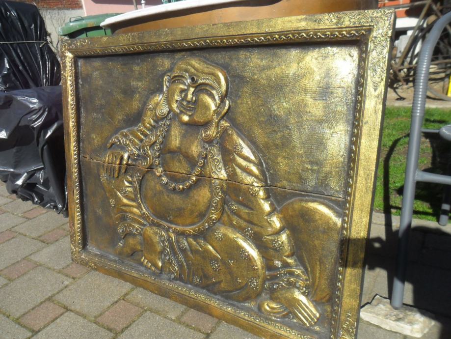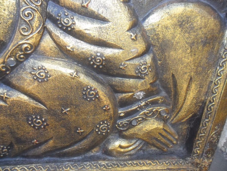 prekrasan rad na drvetu iz 2 dijela i sve zajedno u okviru,motiv je buda ili ?,starost neznam,zanimljiv detal na reljefu je što su u njega umetnuta minijaturna zrcala koja se jako reflektiraju na svijetlost a i vide se obrisi lica ko gleda,jako zanimljivo