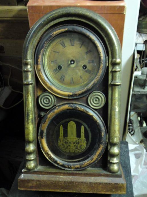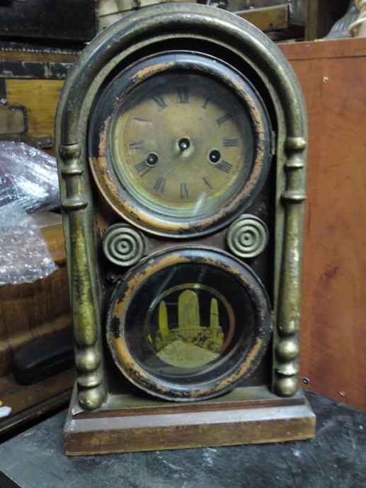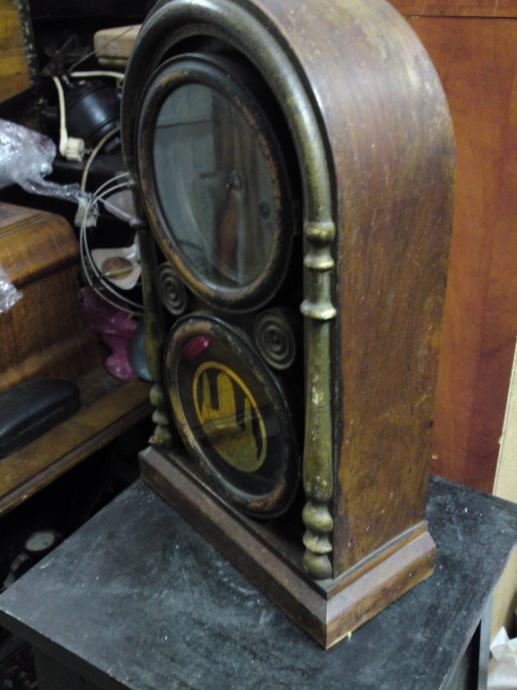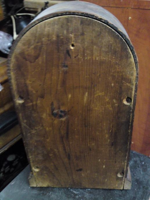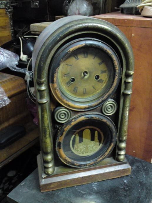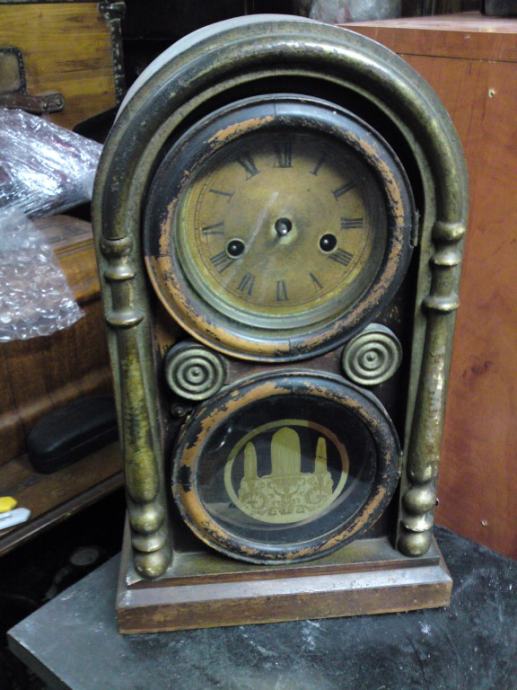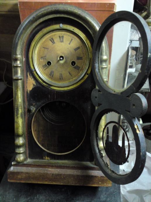 Stari kaminski drveni sat; ima satni uređaj, no nema kazaljke, nije u funkciji, slike sve govore. Za restauraciju ili dogradnju.