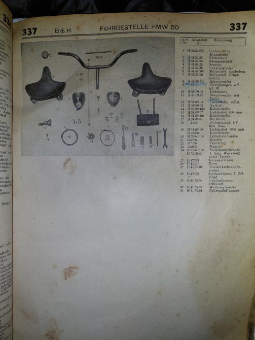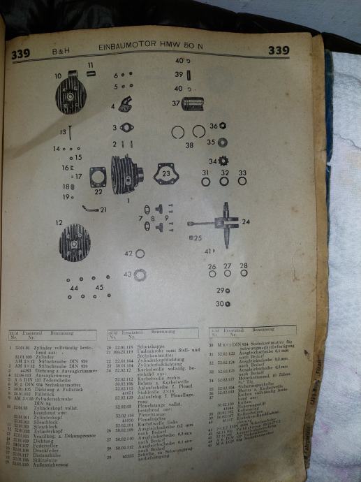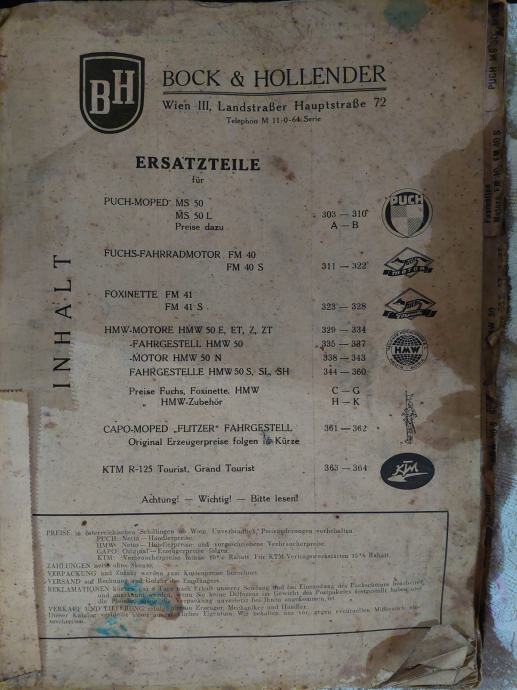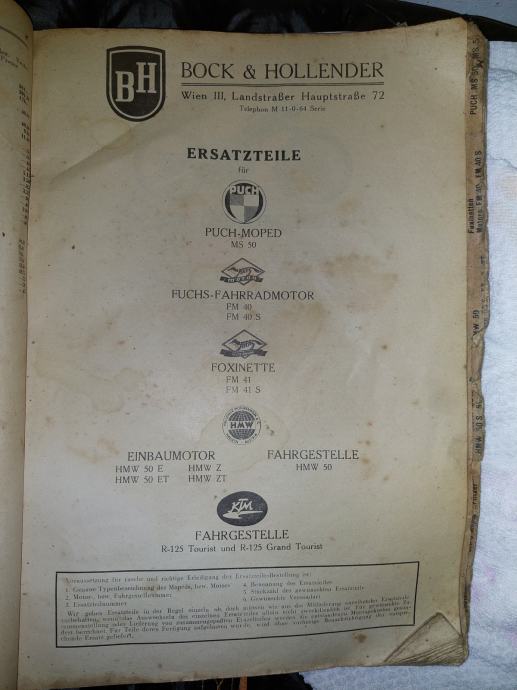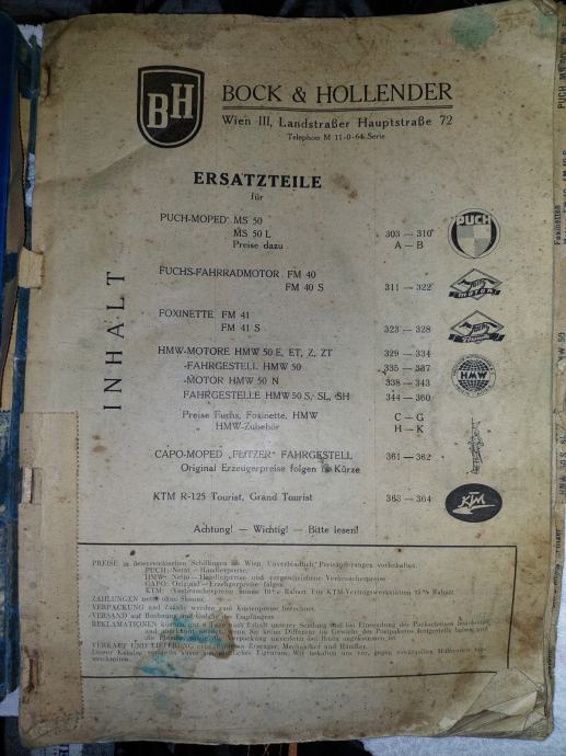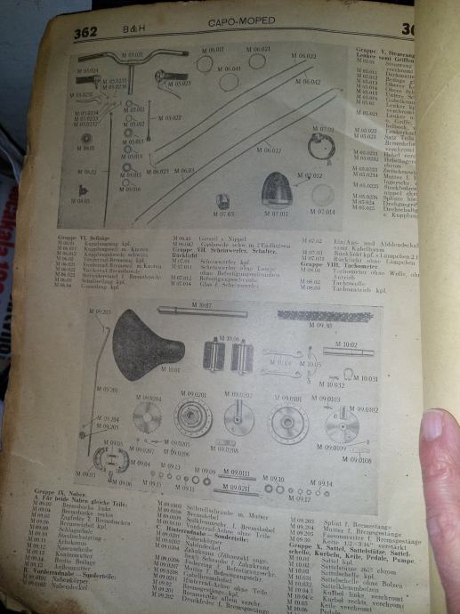 Stari katalog iz 1950-ih za dijelove za mopede. Zanimljiv kolekcionarski primjerak. Veličina 33,5x24,5 cm.