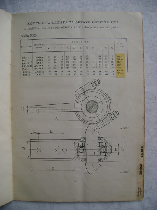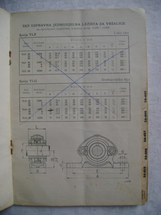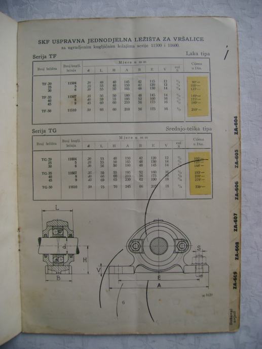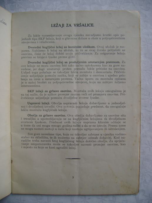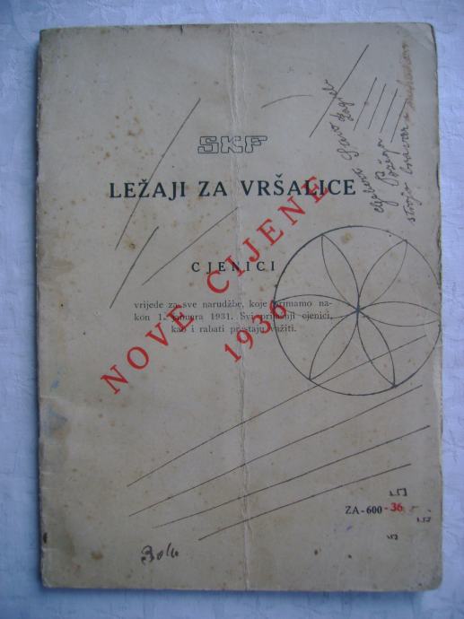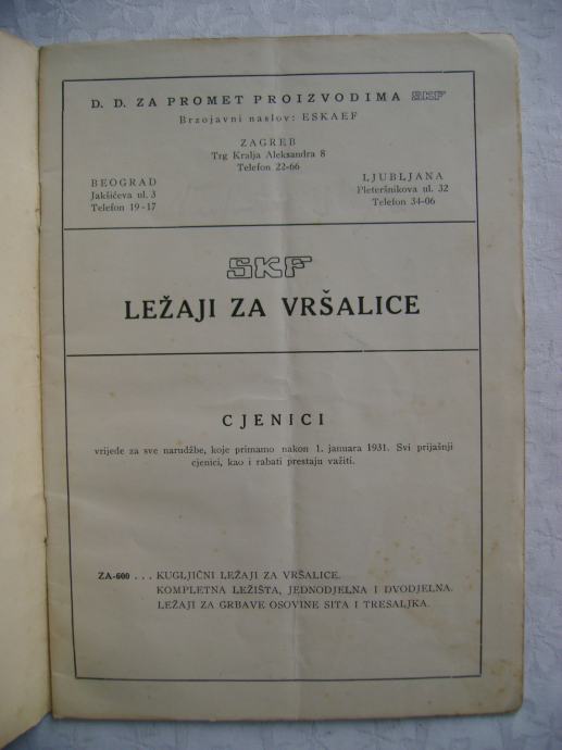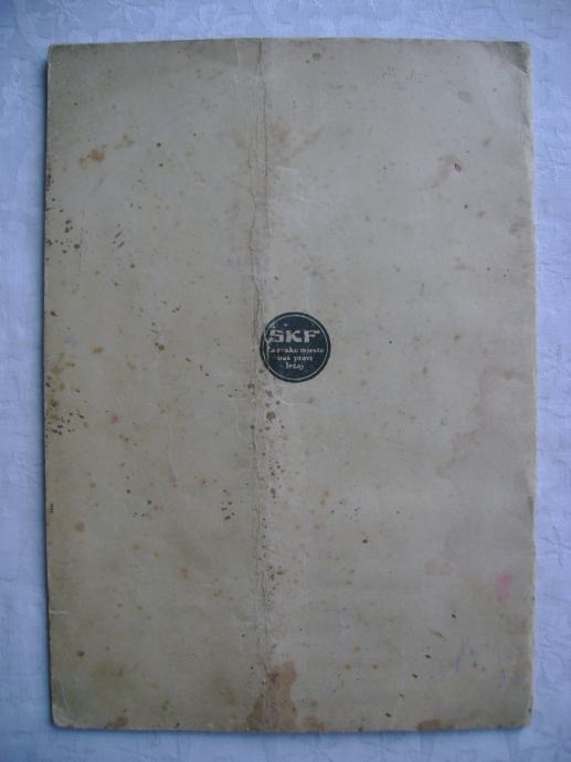 Stari katalog - SKF ležaji za vršalice; Nove cijena za 1936. godinu, 15 x 21 cm, meki uvez, 13 stranica, tehnički podaci sa shemama ležajeva i ležišta.