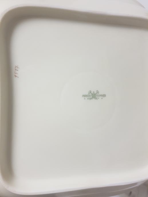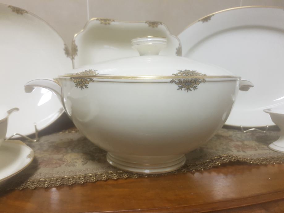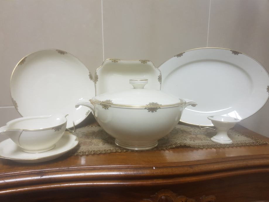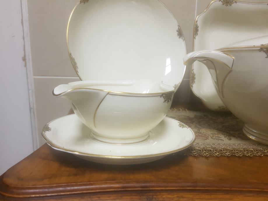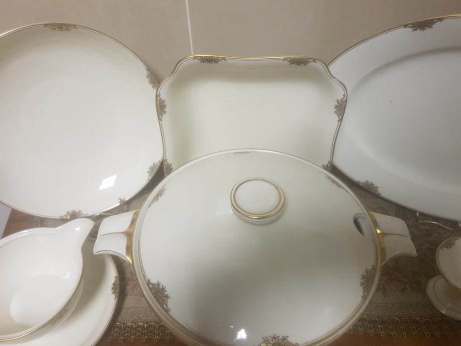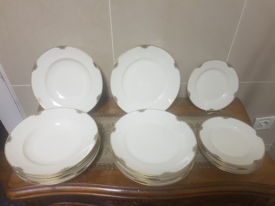 Vrhunski brendirani porculanski servis iz cca 1930.god. Sastoji se od jušnika, ovalnog pladnja, okruglog pladnja, sosijere, zdjele za salatu, 6 dubokih, plitkih i malih tanjura. Servis je apsolutno nekorišten što se vidi po prekrasnoj očuvanoj pozlati. Jedan tanjur je minimalno okrhnut što je vidljivo na fotografiji, ostalo apsolutno besprijekorno stanje. Super prilika za kupnju elegantnog servisa