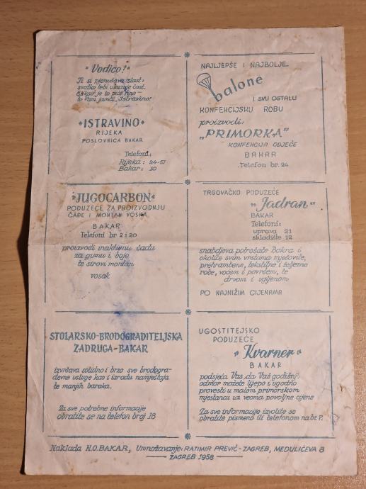 1958.g., 30x21 cm, 4 stranice, i puno lokalnih reklama tadašnjih tvornica, zadruga, restorana i dr.,