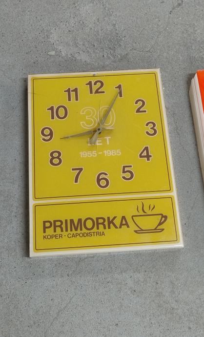 Stari reklamni zidni sat Primorka Koper, materijal tvrda plastika, sat na bateriju, u funkciji, dimenzije 35,0 x 47,0 x 4,5 cm.