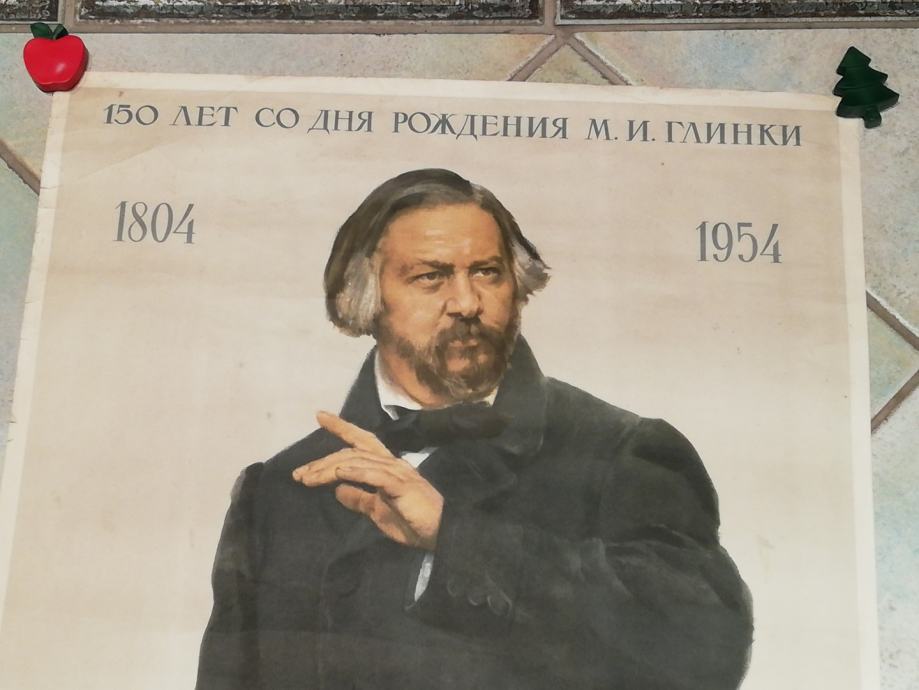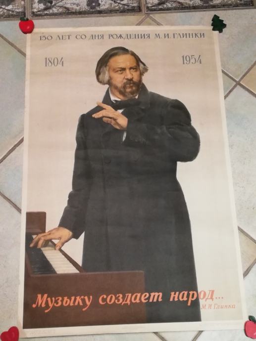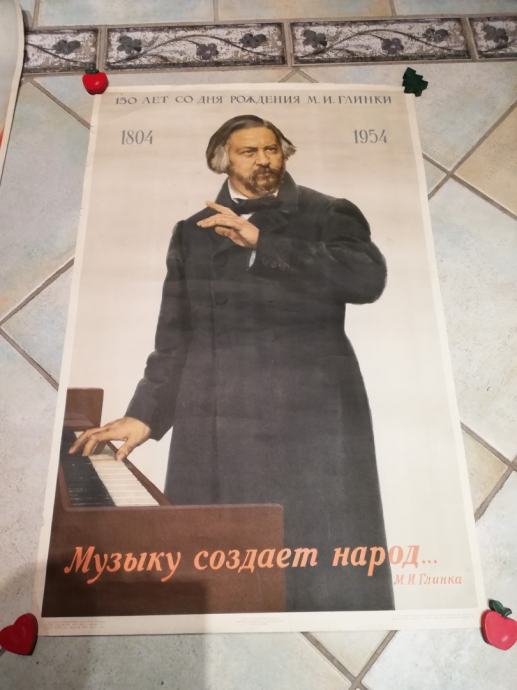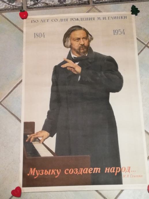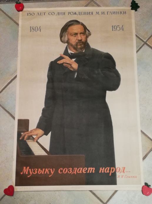 Stari sovjetski plakat iz 1954.g., posvećen obljetnici - 150 godina od rođenja Mihaila Ivanoviča Glinke, ruskog skladatelja, oca ruske glazbe.Rođen u Novospaskoji, 1. lipnja 1804. , preminio u Berlinu, 15. veljače 1857.g.Smatran kao otac ruske glazbe, dobivao je isprekidane lekcije (glasovira) od Johna Fielda, te je u Sankt-Peterburgu napisao neke skladbe. Glinka je neko vrijeme živio u Berlinu. Vrlo su ga inspirirali Vincenzo Bellini i Gaetano Donizetti. 1836. godine napisao je operu "Jedan dan za cara", koja je odmah postala popularna. Njegova druga opera "Ruslan i Ljudmila" iz 1842. na premijeri je doživjela oštre kritike, no poslije je postala vrlo popularna zbog svojih lijepih scena i glazbi.