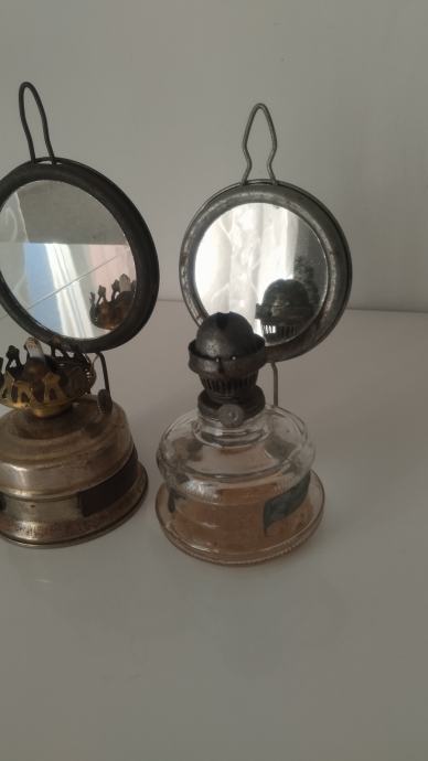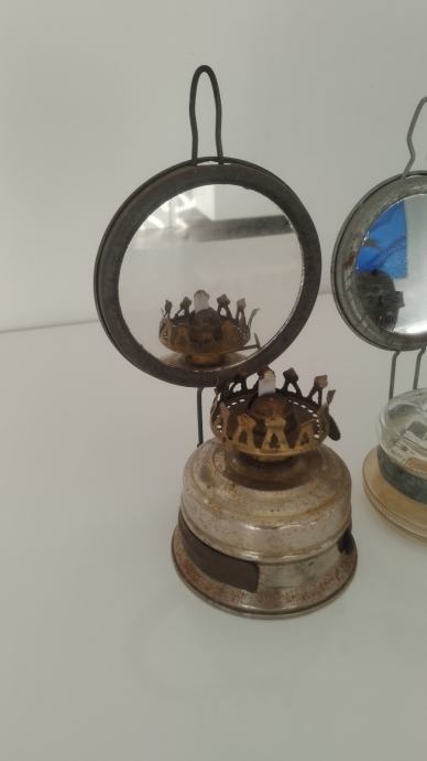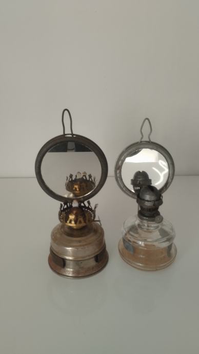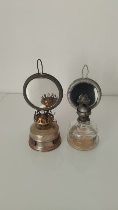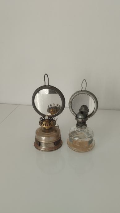 Jedan sa staklenom posudom drugi sa metalnom.Fitilj nedostaje na jednom i stakleni cilindi...