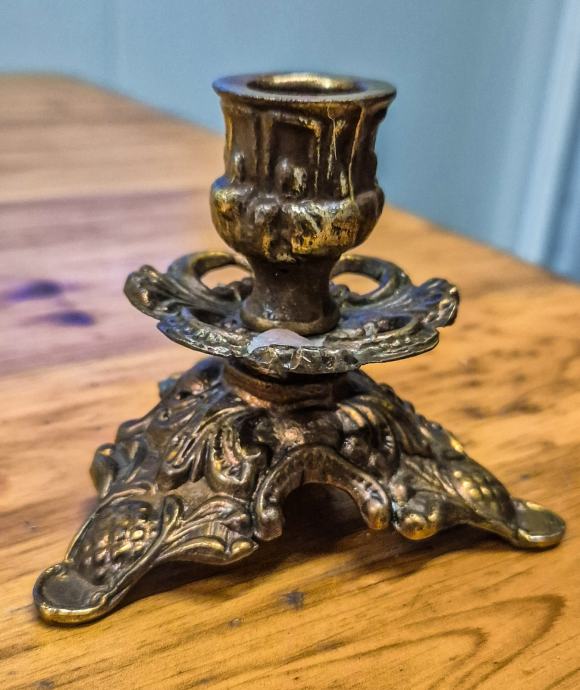 starinski mjedeni svijećnjak s bogatim reljefnim ukrasima.