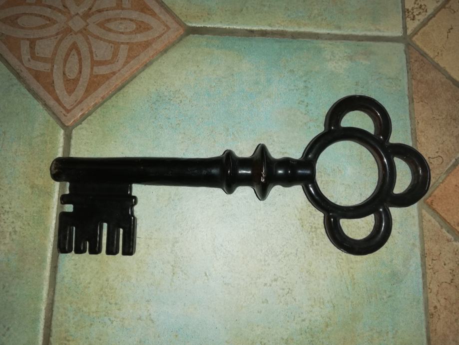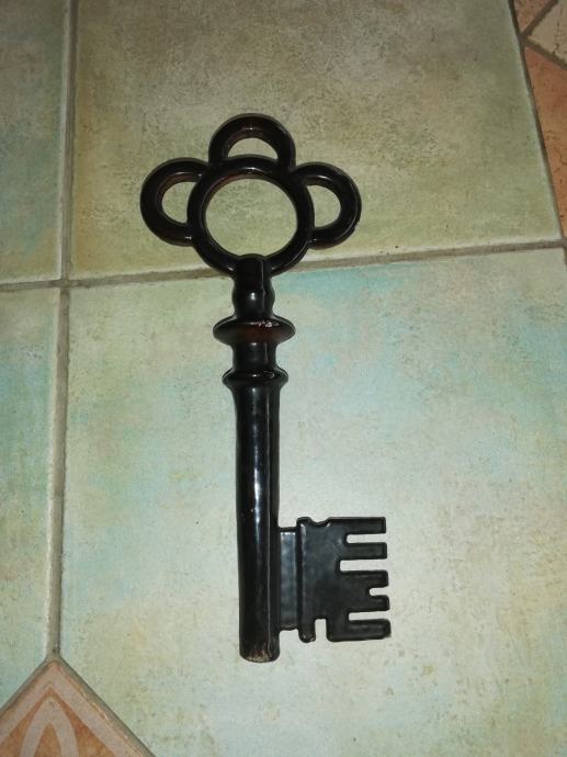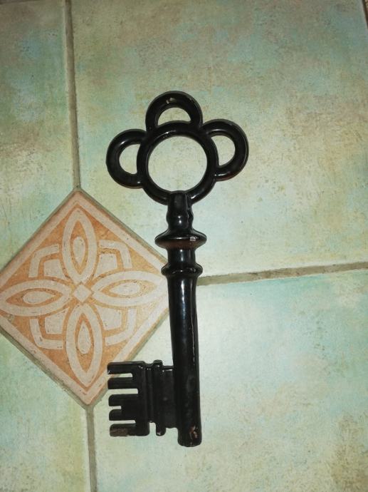 Stari veliki željeni ključ, crne boje, materijal :emajlirano željezo, dimenzije: dužina: 32,0 cm, širina: 13,5 cm, debljina: 5,0 cm.