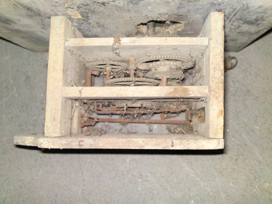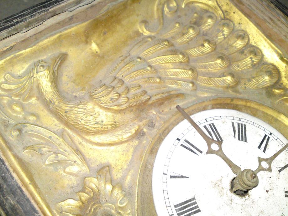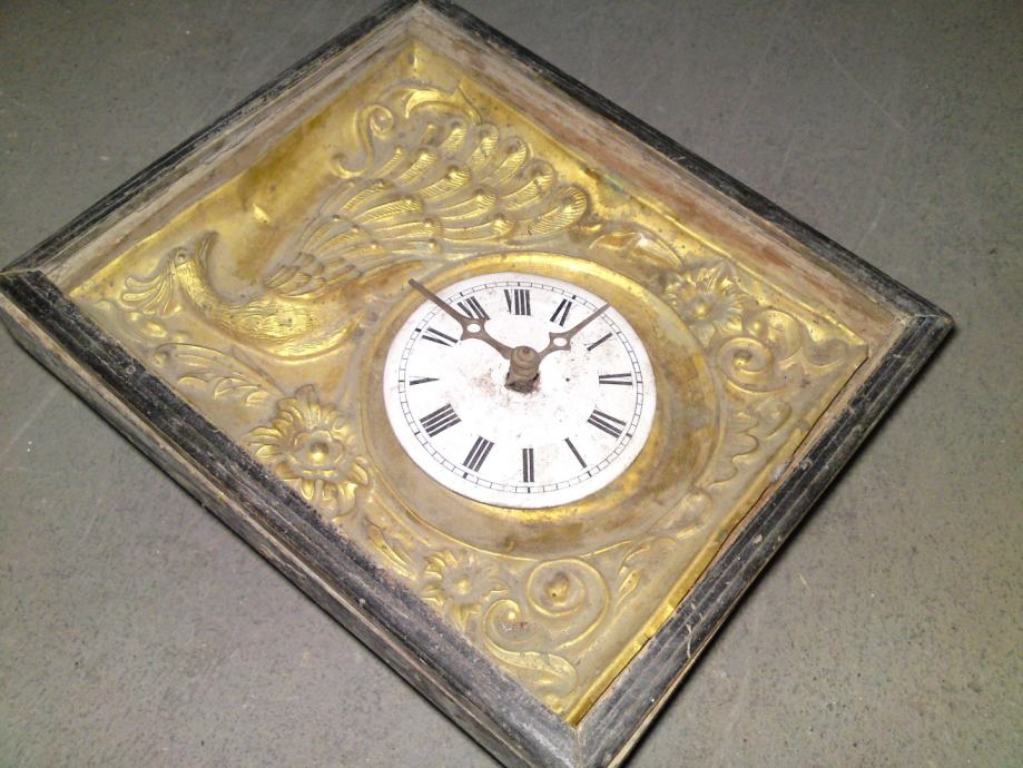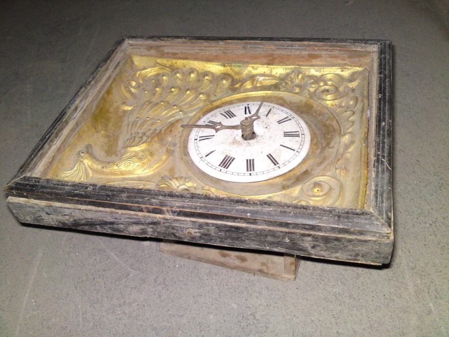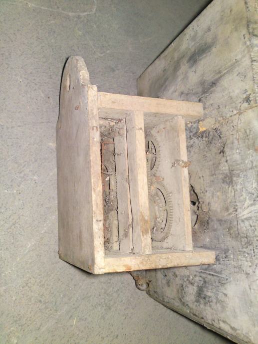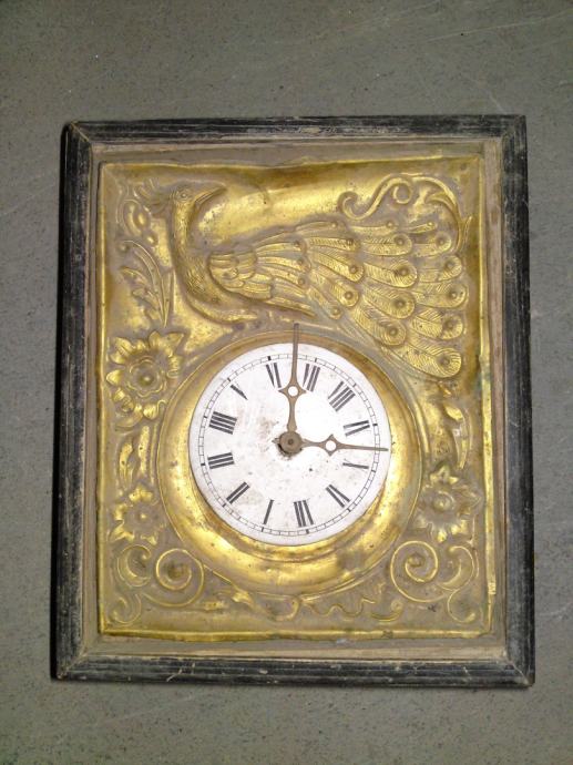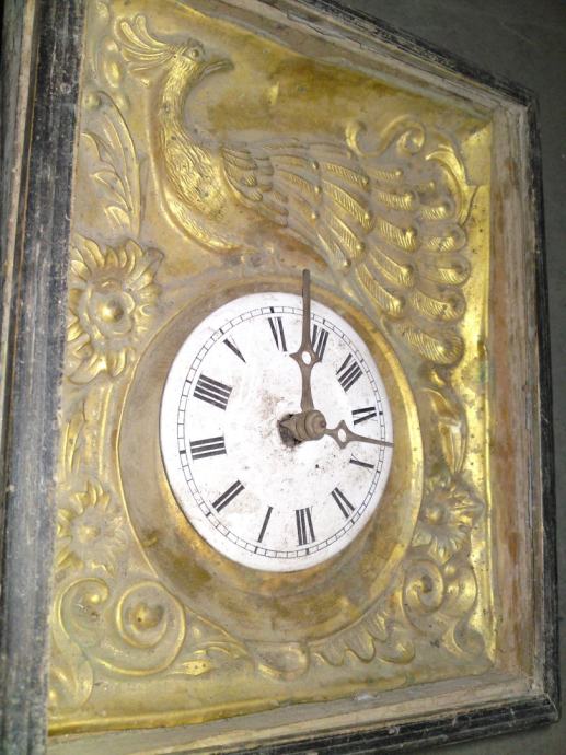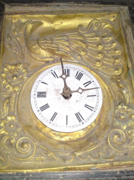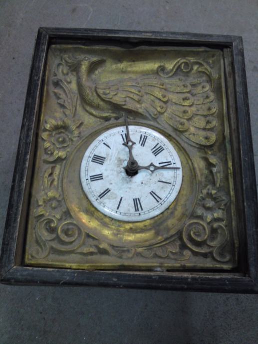 Stari zidni sat tzv. šoten, za restauriranje; drveno kučište mehanizma, ciferblat i vanjska dekoracija u odličnom stanju, prodaje se kao neispravan; dimenzije: visina: 24,5 cm; širina: 20,5 cm; dubina: 13,0 cm.