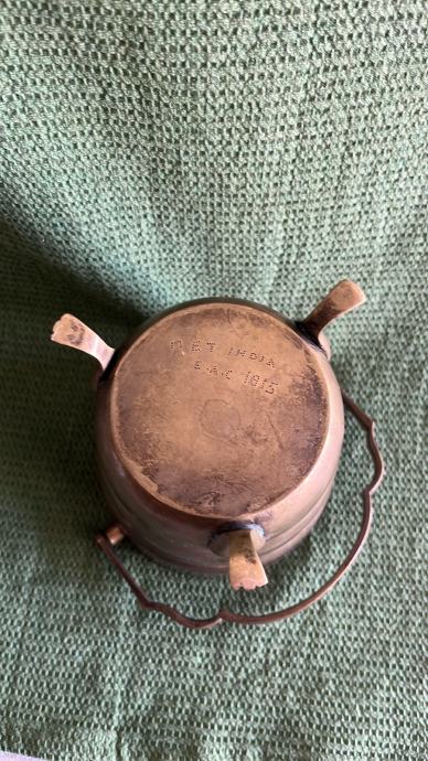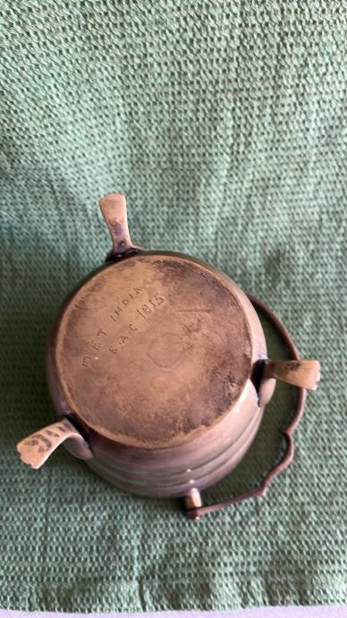 Visoka sa ručkicom cca 18 cm , široka cca 11 cm. Na dnu je izgravirana godina 1915 , Indija