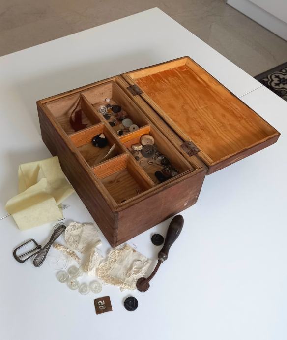 Starinska drvena kutija za šivaći pribor ili za nakit sa umetkom s pretincima tako da je na dvije etaže.