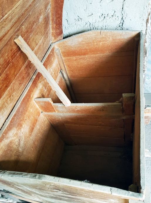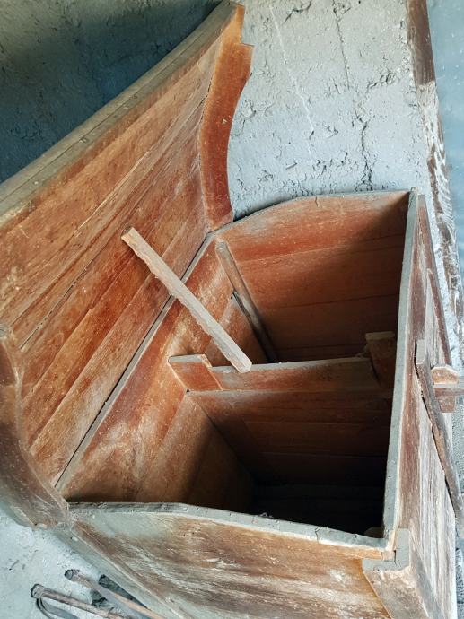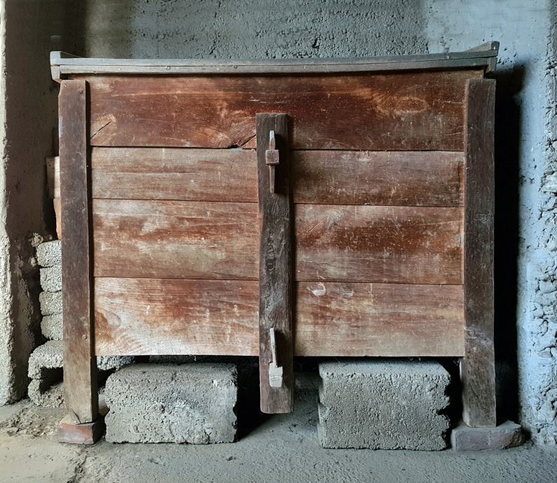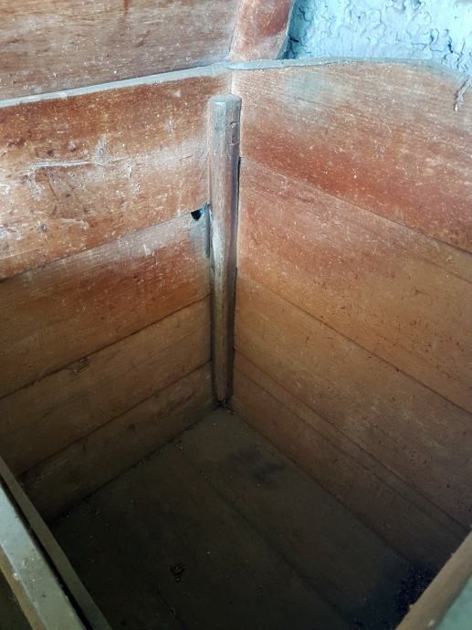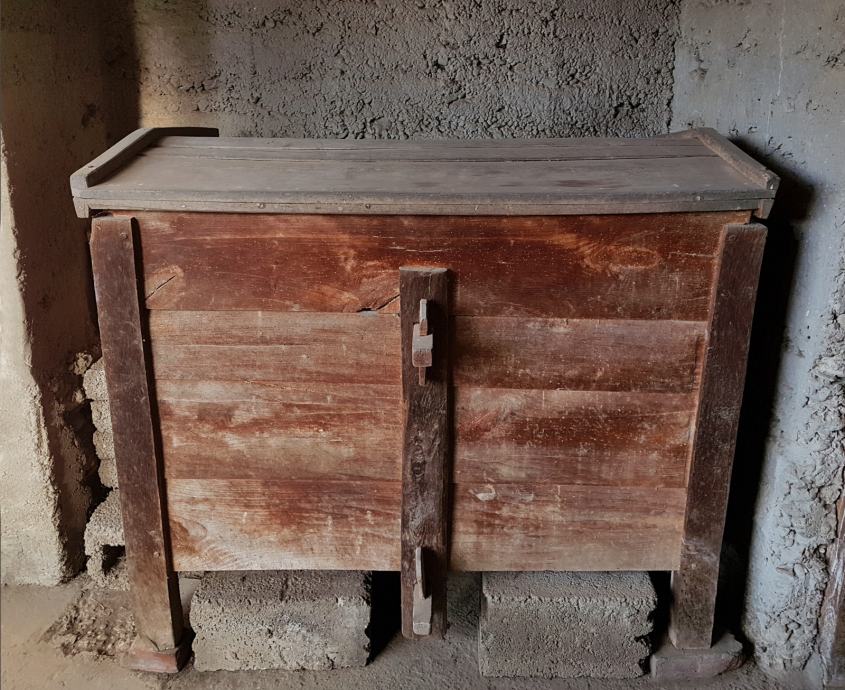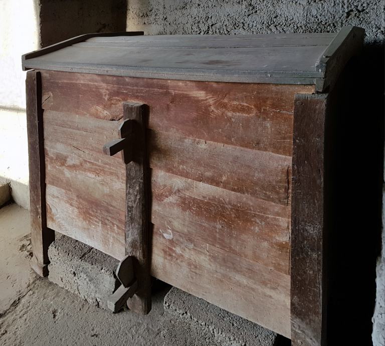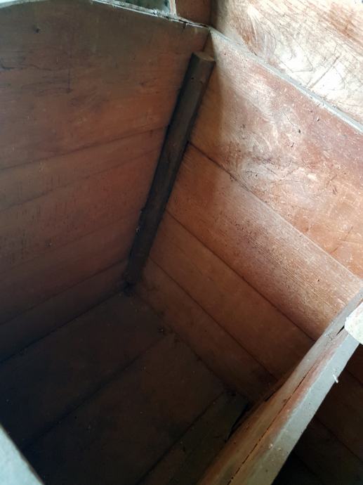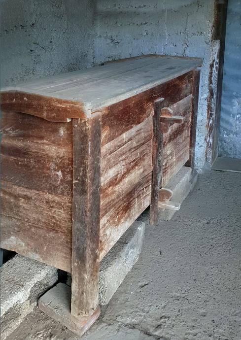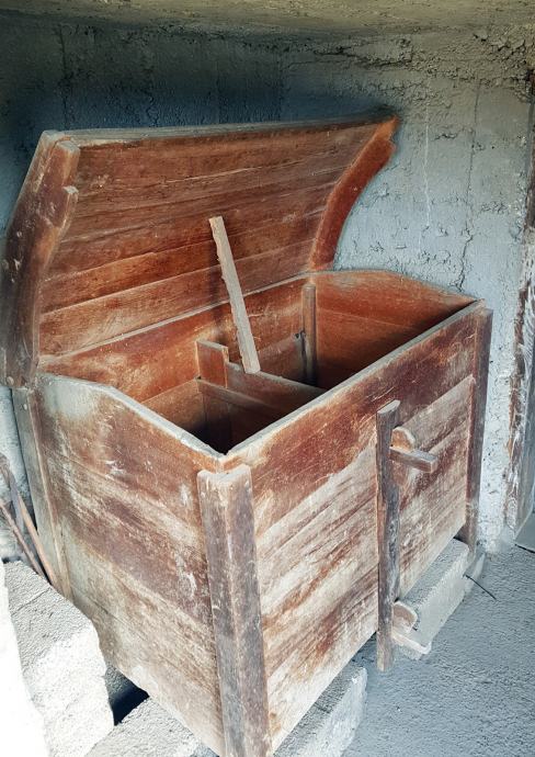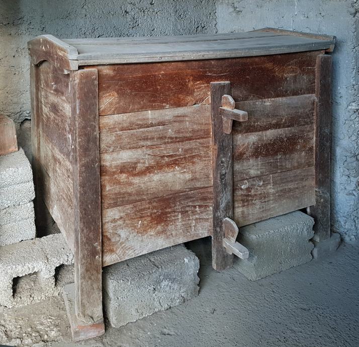 Starinska škrinja većih dimenzija, drvena, kvalitetna izrada. Škrinja je služila za pohranu žita i sl. Spajano samo s drvenim klinovima, bez metalnih spojnih dijelova (čavala i šarafa). Pogodno za restauraciju.