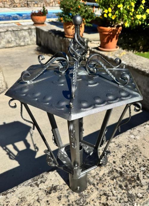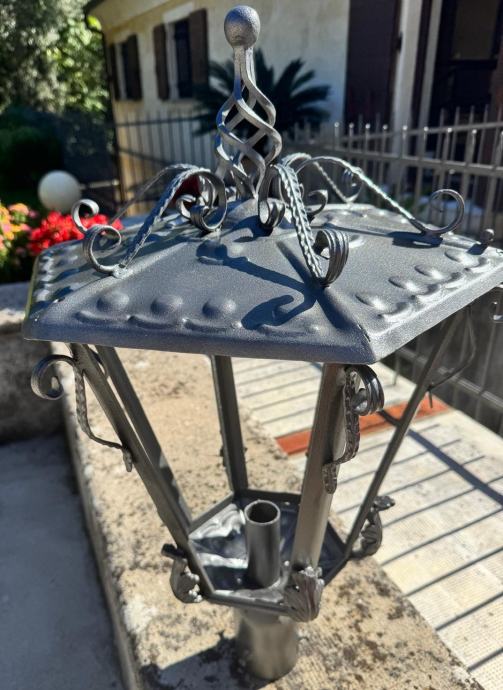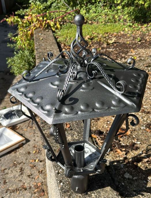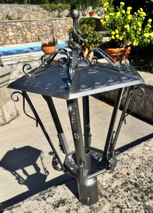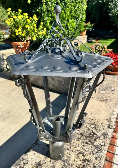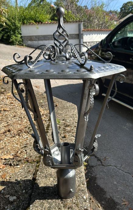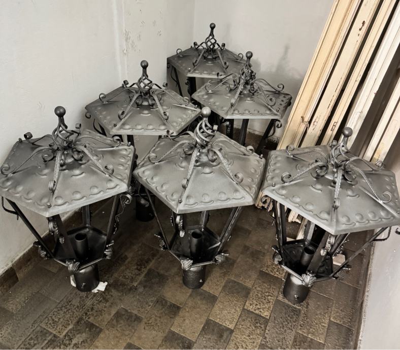6 komada starinskih uličnih svjetiljki, visina 76cm, max sirina 47cm, fi postolja za cijev 80mm, ispjeskarenih i ofarbanih temeljnom antiknom bojom, stakla i električna oprema nisu montirani ali postoje, prodajem u kompletu sa popustom ili pojedinačno po navedenoj cijeni.