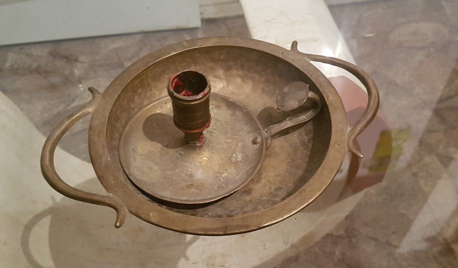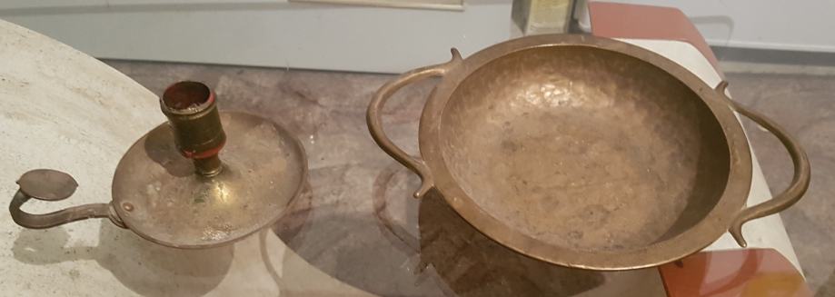 Starinski ručno rađeni bakreni svijećnjak, zvan mjesečar te bakrenu posudicu za odlaganje manjih stvari ili jednostavno za ukras