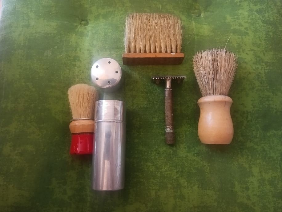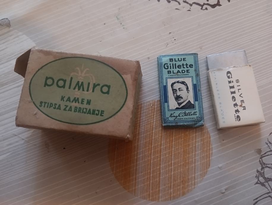 Prodajem starinski komplet za brijanje, aparatić za brijanje, dvije četkice za pjenu, jedna ima aluminijsku futrolu, kamen-stipsa za brijanje, par komada žileta i starinska četka bez ručke. Cijena za sve. Plačanje na račun ili gotovina.