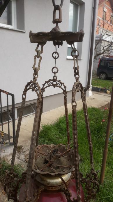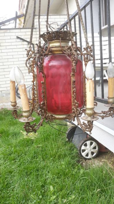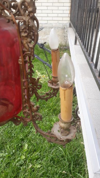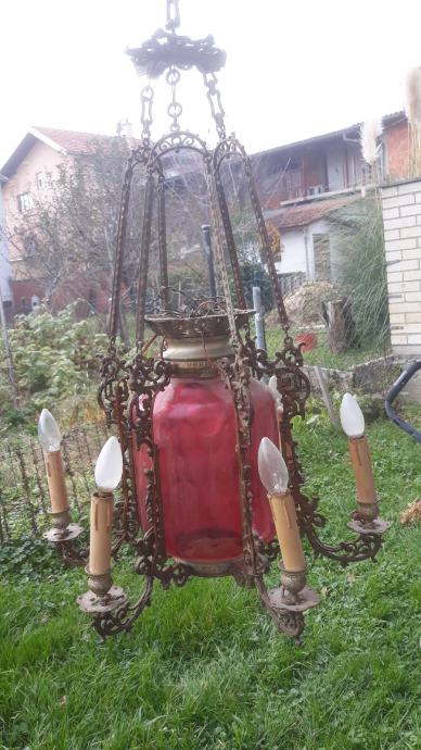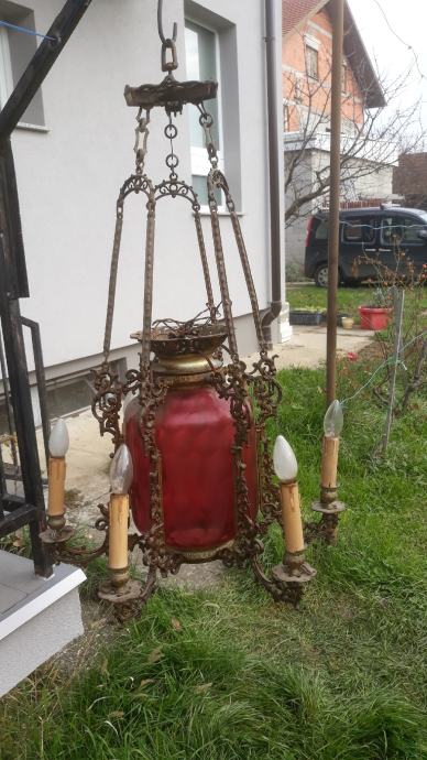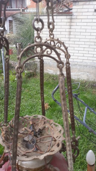 Starinski luster vrlo ljep i atraktivan. Star je vjerojatno vise od 100 godina. Čitav je i kompletan. Bila bi mu potrebna obnova....vise da se ocisti i obnovi instalacija.sve djelove ima. Pravi je raritet..