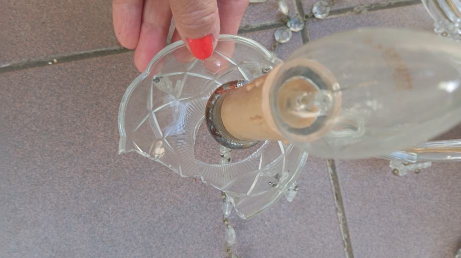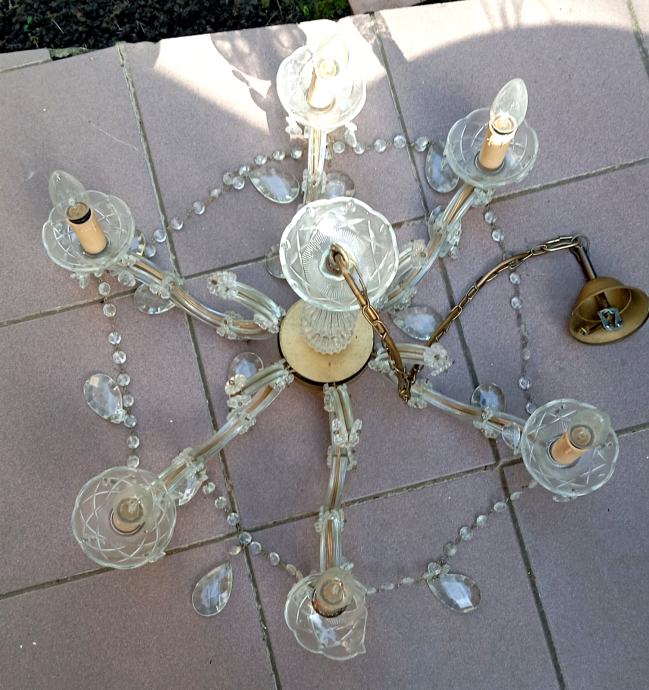 Luster star preko 60 g kojem treba promijeniti elektriku.Manja oštećenja, razbijena jedna staklena podloga za žarulju.