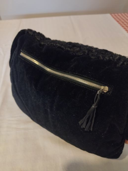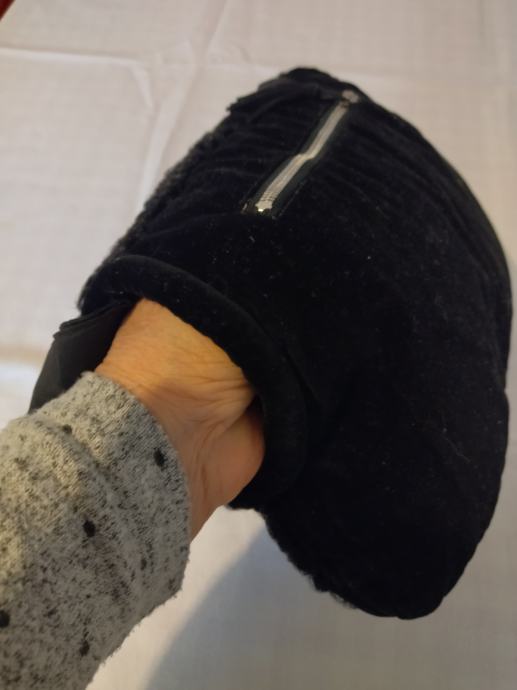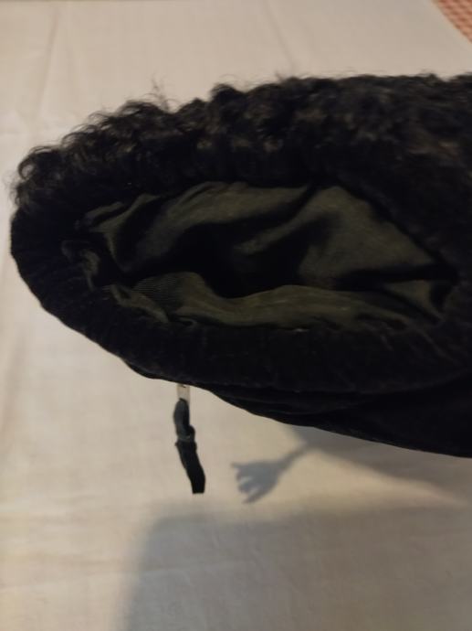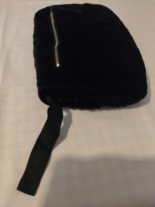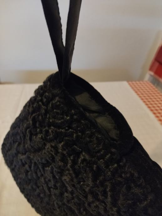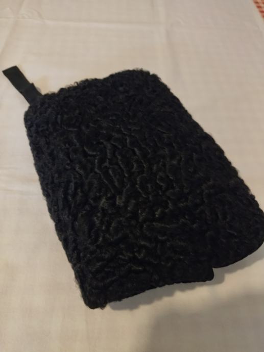 Ovaj muf je izrađen od astrahana crne boje s prednje strane, sa zadnje crni pliš unutar kojega se nalazi džep koji se zatvara metalnim zatvaračem. Punjeno perjem, s obje strane otvori za ruke. Ručka od tkanine, pa se može nositi kao torbica.
