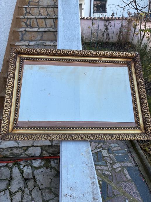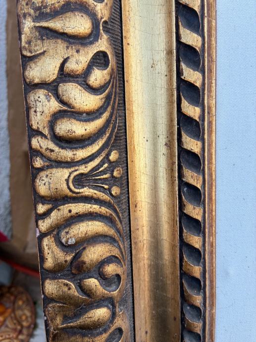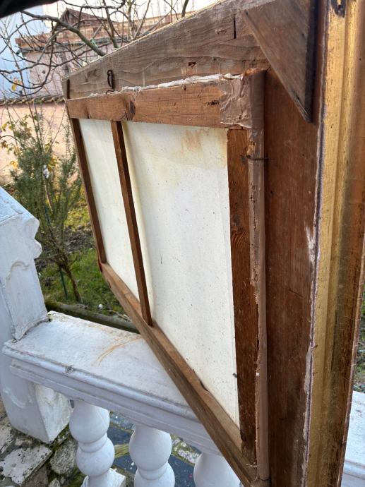 Starinski drveni okvir vanjskih dimenzija 113x76 za sliku velicine 91x56 sve vidljivo na slikama drvo nije trulo okvir nije uredivan nego je u svom orginal izdanju zlatno crne boje ima platno sa straznje strane bez stakla zvati na 0981340885 dostupno u zg ne saljem postom samo osobno preuzimanje