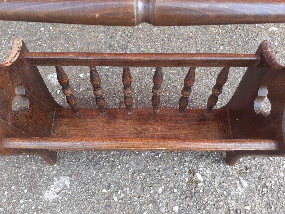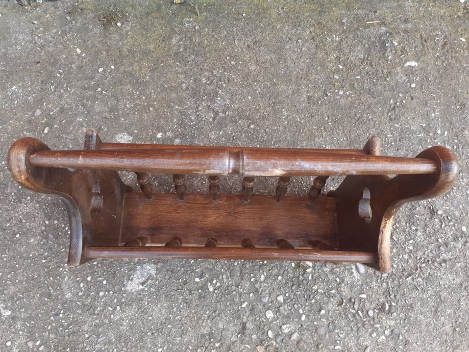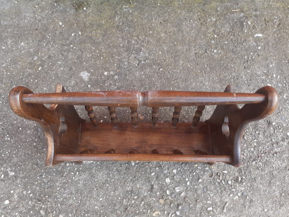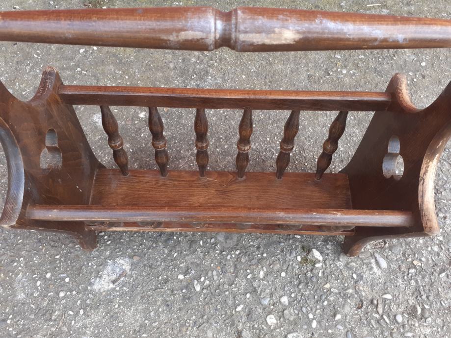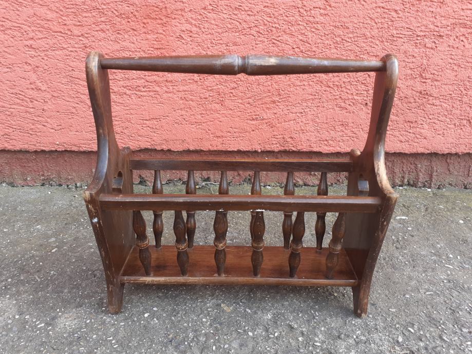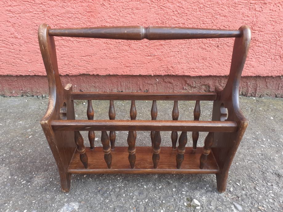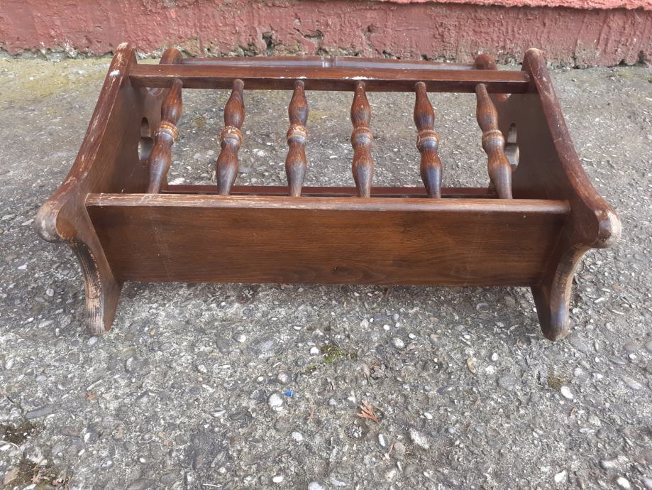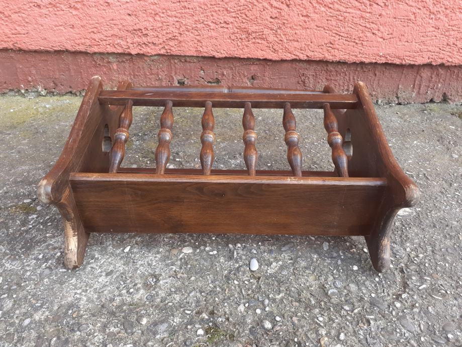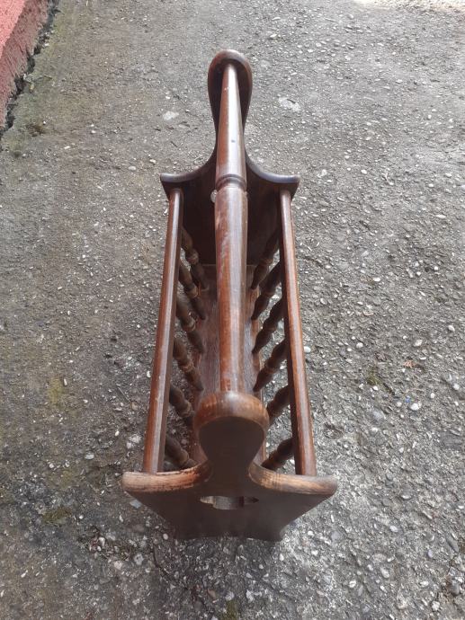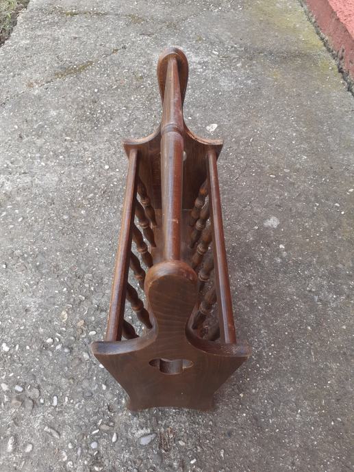 Prodajem drveni vintage stalak za novine. Star je sigurno 40 godina (to znam sigurno, jer je toliko kod nas u obitelji), a vrlo vjerojatno i puno više. U vrlo dobrom je stanju, bez oštećenja, uz naravno vidljive tragove korištenja. Dimenzije stalka su: duljina cca 46 cm, širina na donjem dijelu je cca 10 cm, na gornjem cca 18 cm, a visina cijelog stakla je cca 44 cm. Slikan je detaljno i sa svih strana, tako da se vidi njegovo stvarno stanje.