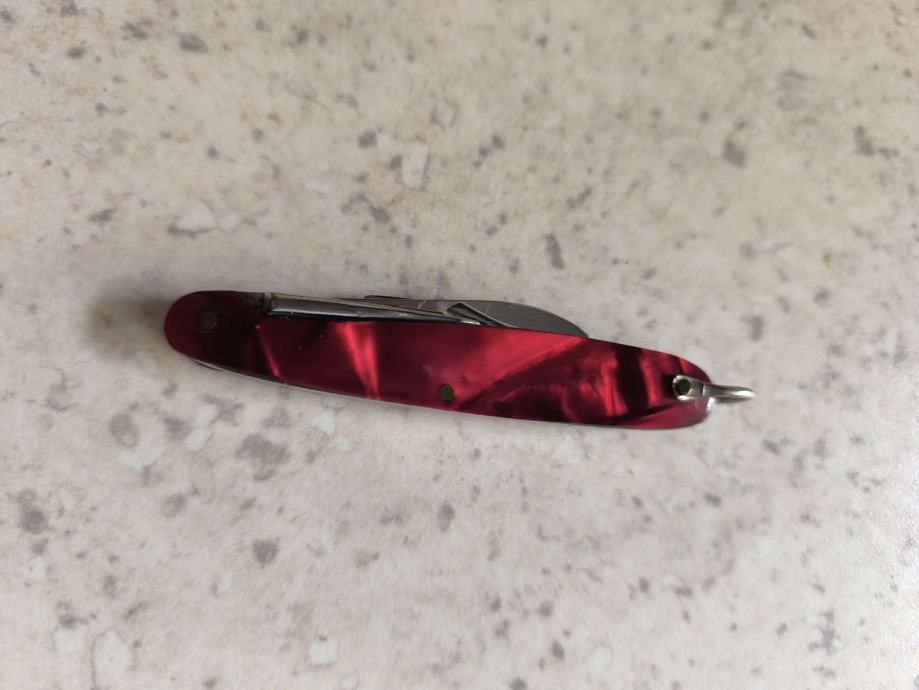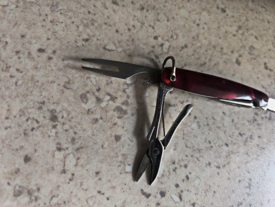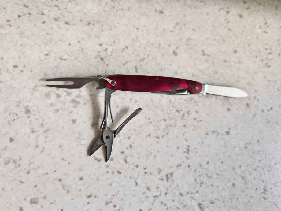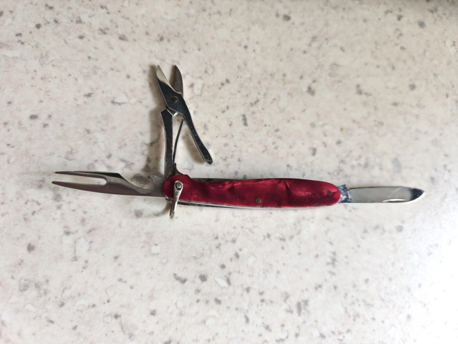 Ima nožić, škarice, otvarač za boce i vilicu.