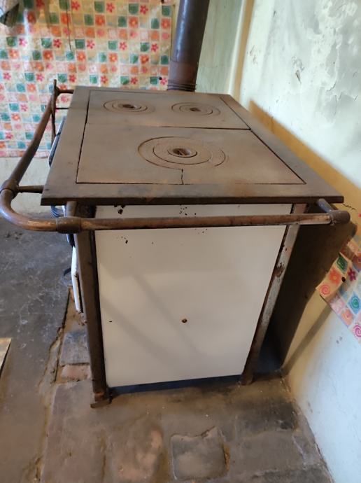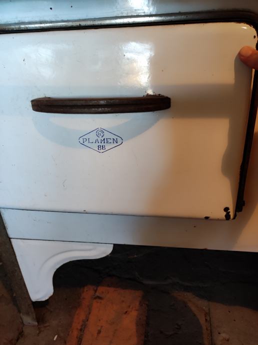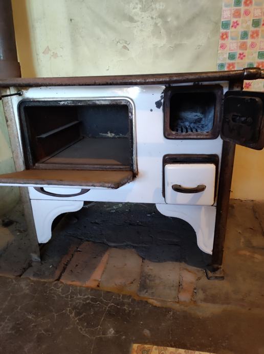 Dobro očuvan štednjak iz šezdesetih godina dvadesetog stoljeća. Vrata pećnice ne mogu se zatvoriti.