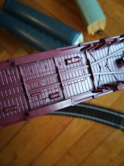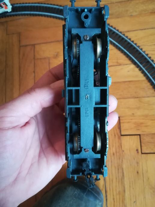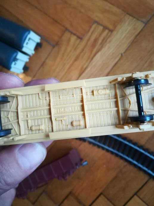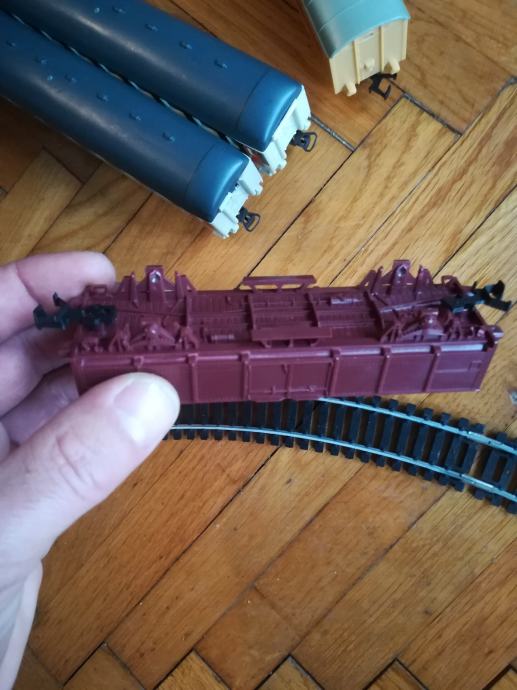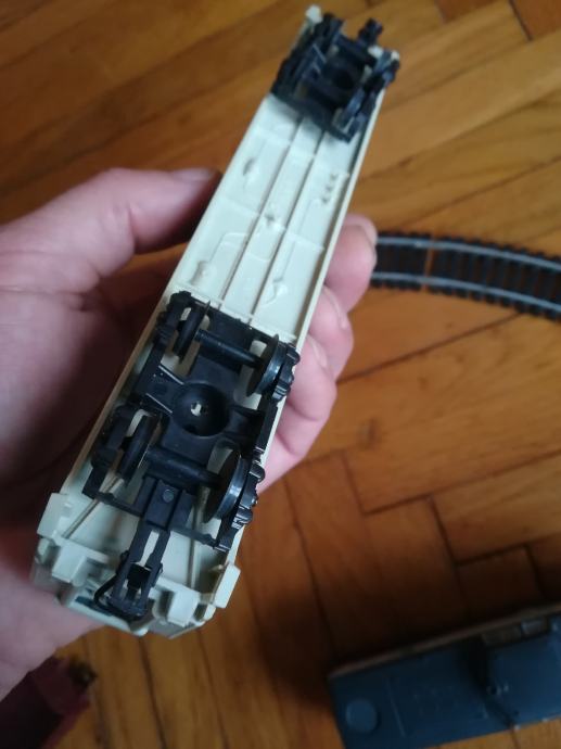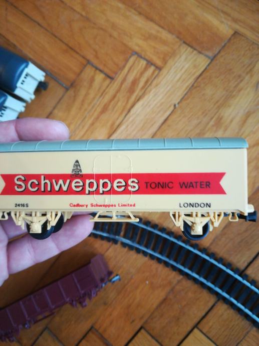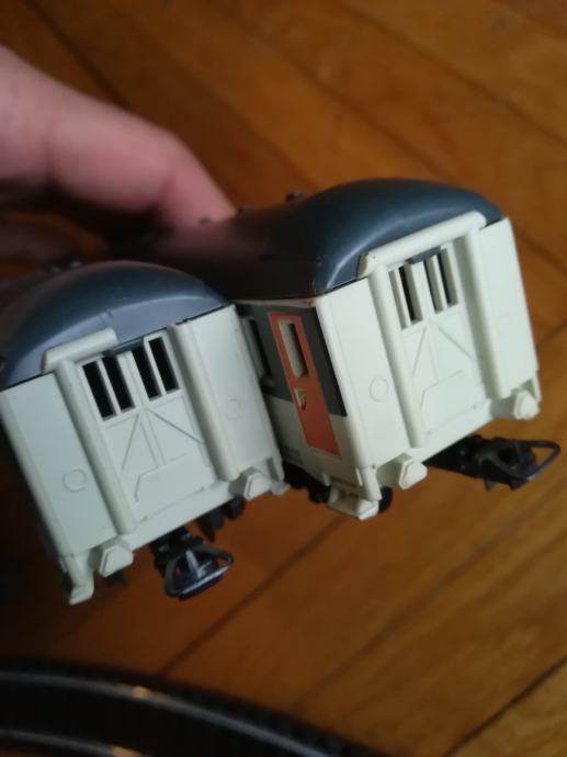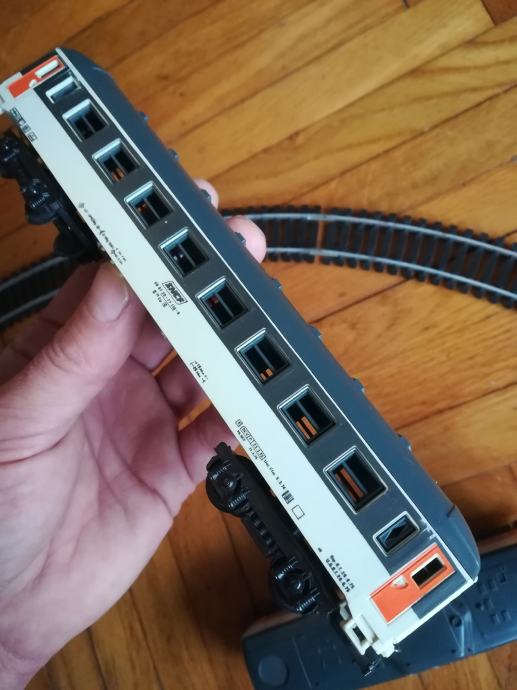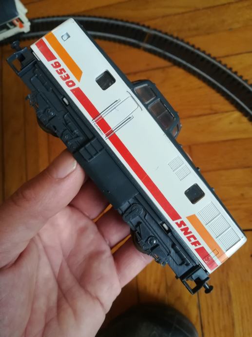Igračka starinski vlakić vlak set Lima SNFC. Lokomotiva i vagoni SNFC su super očuvani osim nadvratnice na jednom od vagona ( na fotki). Extra vagoni su isto Lima, imaju drukčije kuke, ali su isto HO. Schweppes vagon je potpuno nov, a smeđi nema kotače. Tračnice treba pobrusiti da bolje provode struju, na 2 tračnice se vidi oxidacija. Ima ukupno 10 tračnica. Vlak je iz 80ih. Cijena je fiksna. Na sms nemogu odgovoriti, najbolje bi bilo da me nazovete 099 687 5657 ili pošaljete poruku preko Njuškala. Vlak vlakić željeznica lokomotiva maketa