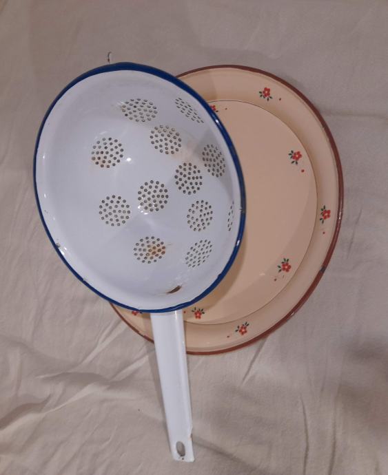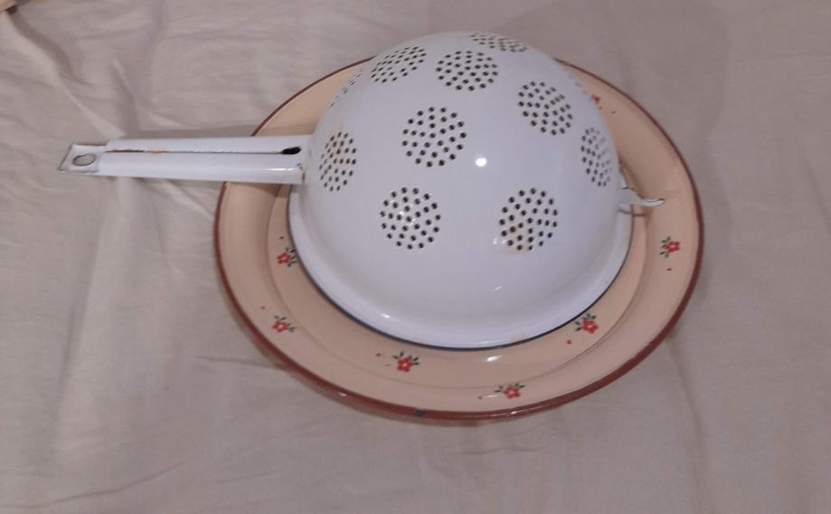 Cjediljka i 2 emailirane posude za pecenje bureka ili posluživanje,takoder.dekor.Ne saljem.