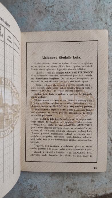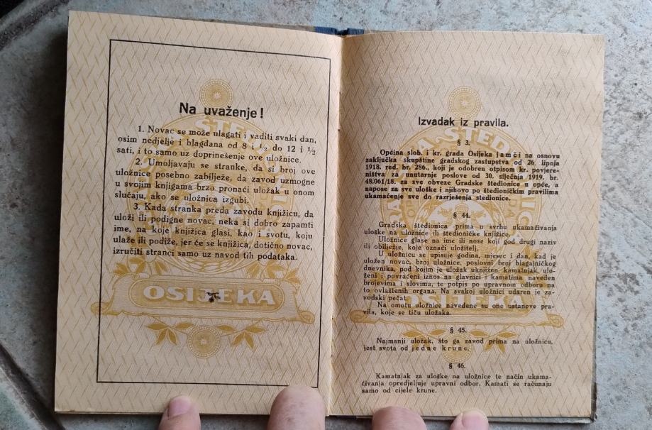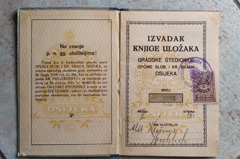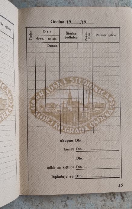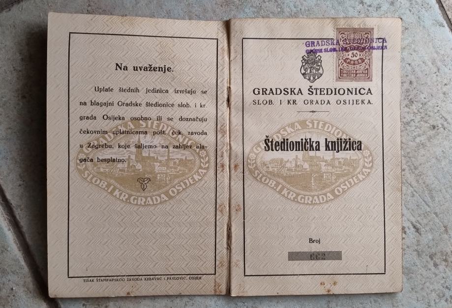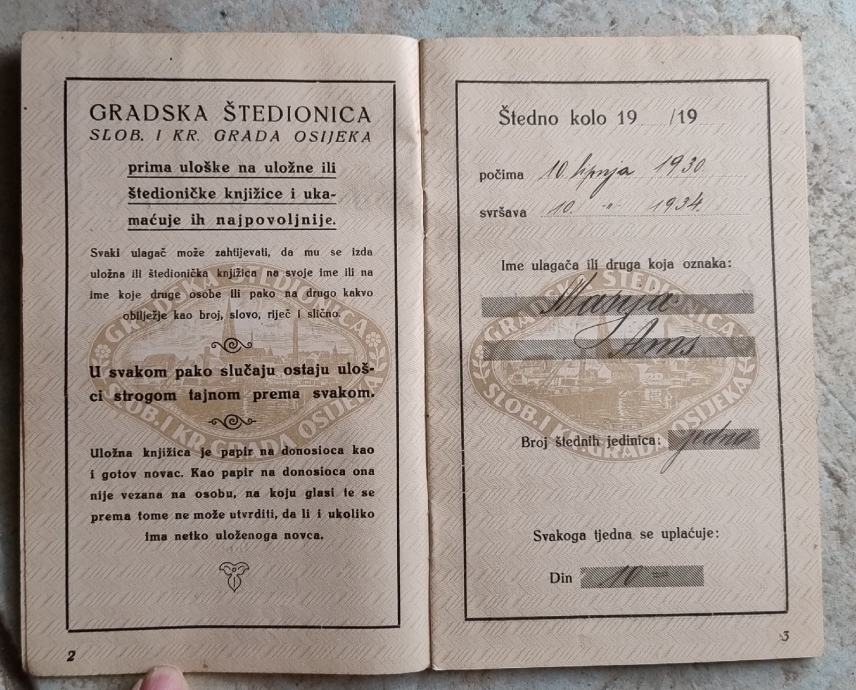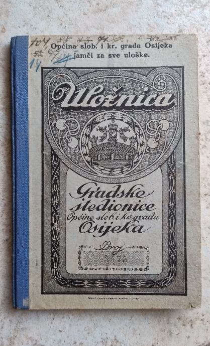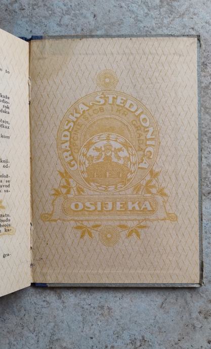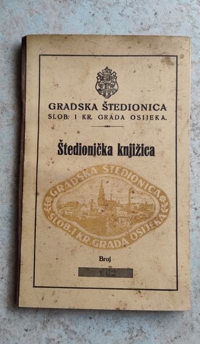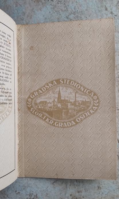 Uložnica Gradske štedionice slobodnog i kraljevskog grada Osijeka iz 1930.g. , dimenzije 18,4 x 11,6 cm.