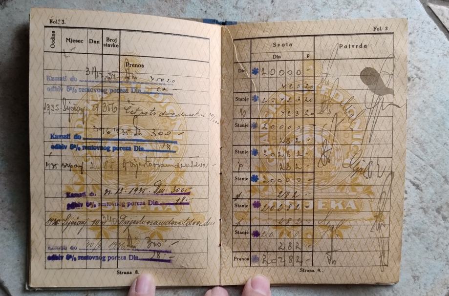 2 stare štedne knjižice štedionica iz Osijeka : Uložnica Gradske štedionice Općine slobodnog i kraljevskog grada Osijeka iz 2931. g., 20 stranica i korice, dimenzije 16,8 x 11,5 cm