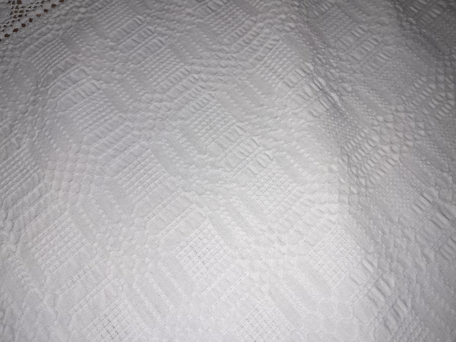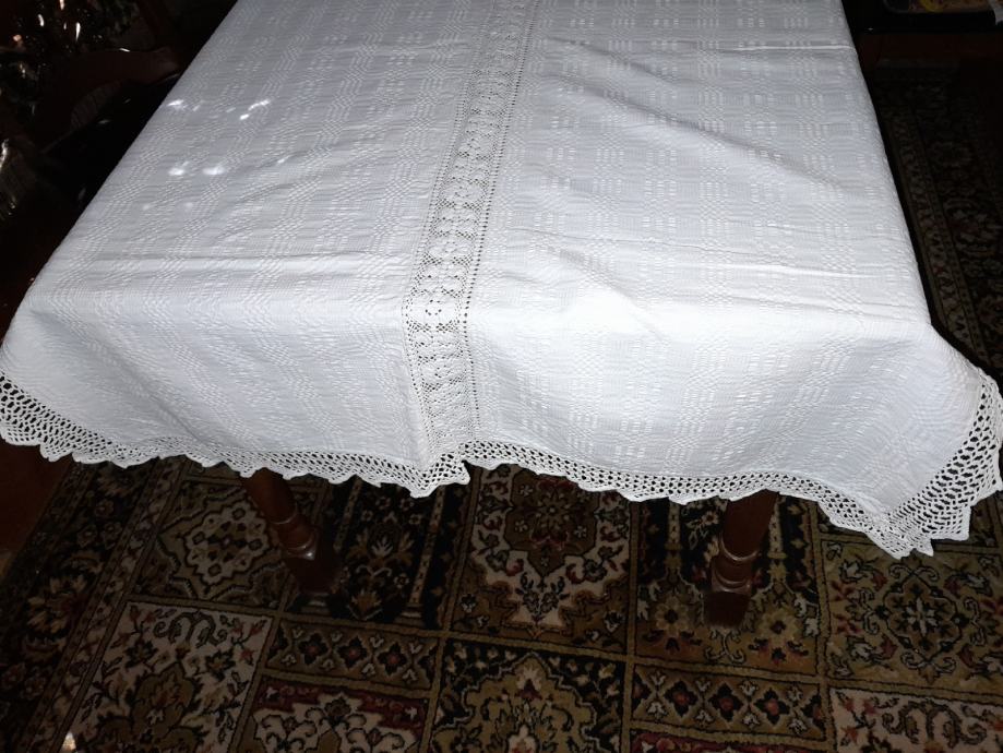 Stolnjak je od domaćeg tkanog platna urešen ručno heklanom čipkom. Starosti je oko 100 god. i nikada nije rabljen. Dimenzija 215 × 105. Obiteljska ostavština