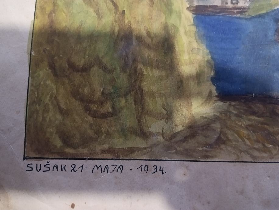 Prodajem stari školski crtež jezera sa kućicama, nacrtano u 2 razredu na Sušaku 1934g, papir-drvene bojice. Duzina 30.50cm, sirina 23.50cm. Plačanje na račun ili gotovina.