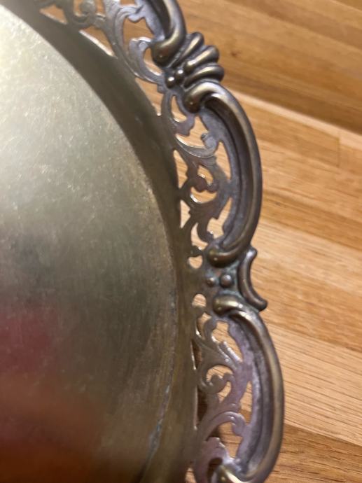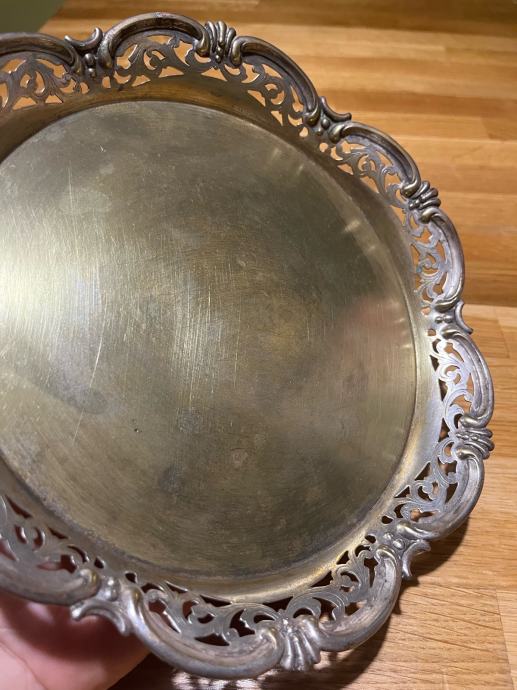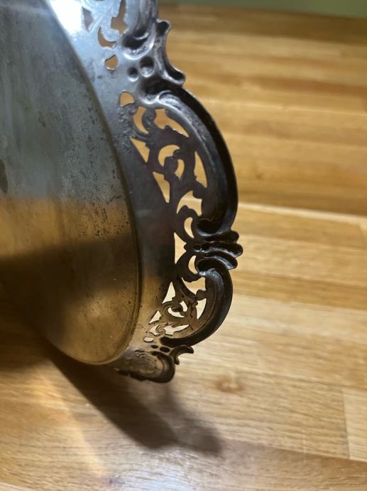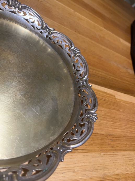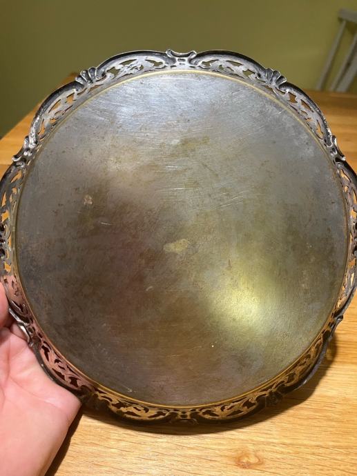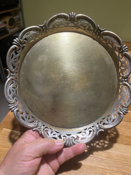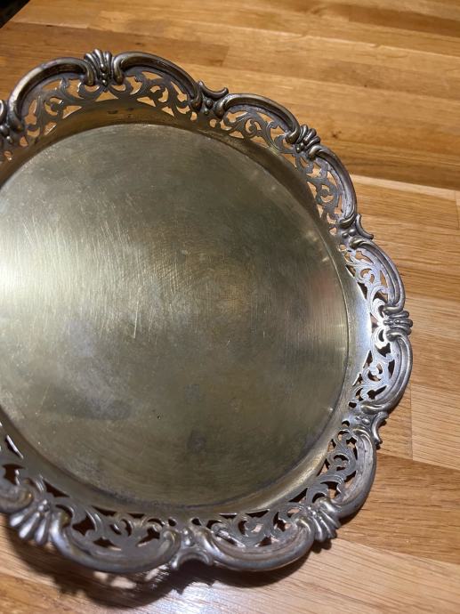 Veoma stara tacna iz Engleske , materijal je najvjerojatnije mesing koji je posrebren , ali sa godinama se istrošio na dnu . Lijepo izrađena . Širine 23 cm , visine 2 cm .
