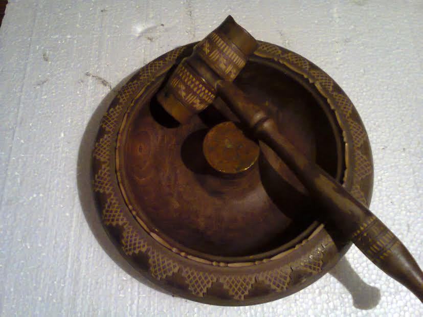 izrezbareni drveni tanjur i bat za čišćenje oraha i lješnjaka