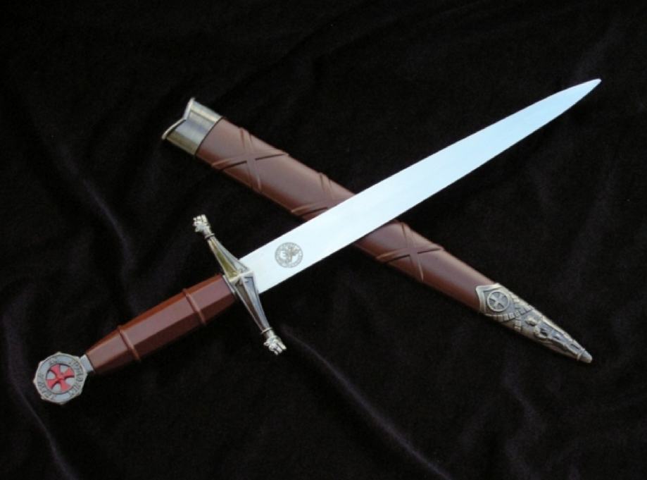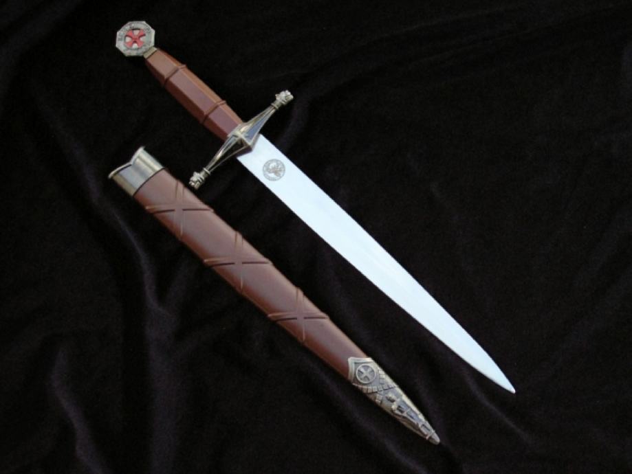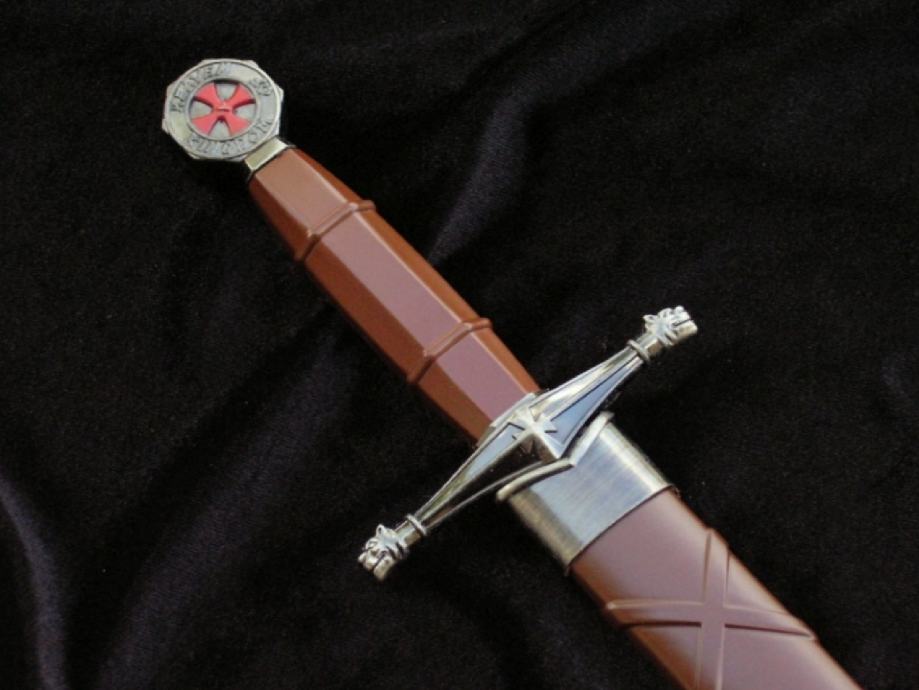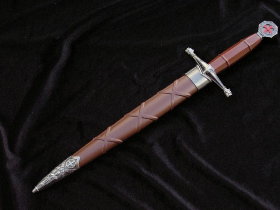 Replika temeljena na povijesnim nacrtima. Replika je dekorativna. Nije za trening ili borbu. Oštrica: nehrđajući čelik 440, glatka s obje strane. Osim toga, s jedne strane na dršku graver u obliku templarskog pečata s natpisom: SIGILLUM MILITUM CHRISTI (Pečat Kristovih ratnika) Korice: plastika Okov: metalni bogato gravirani donji dio ukrašen križem i likom templara Drška - metal urezan sa simbolima povezanim s Redom templara Glava: metalna sfera s križem i natpisom: Kraljevstvo nebesko Rukohvat: metal bogato ugraviran s križem vitezova templara Duljina s koricama: oko 40,5 cm Duljina bez korica: oko 37 cm Dužina oštrice: oko 24 cm Širina oštrice na dršci: cca. 2,4 cm Debljina oštrice na dršci: cca. 3 mm Težina s koricama: 0,23 kg Težina bez korica: 0,17 kg