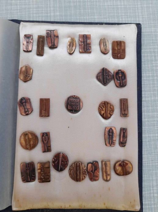 tvrdi uvez, dimenzije 11x16 cm, 26 značaka titovih štafeta, original, vidi slike