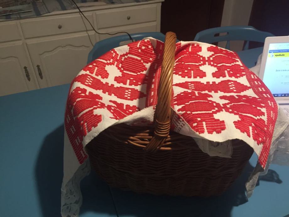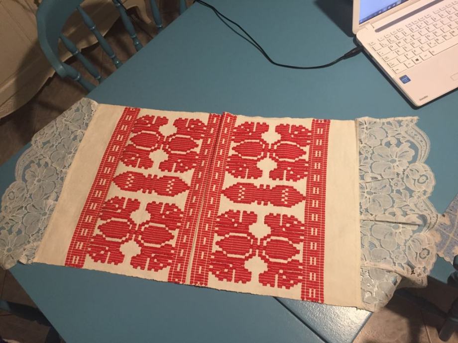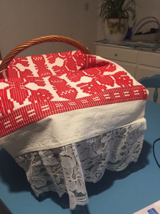 TKANI PEŠKIR ,POKRIVALO ZA KORPU IZ BOSANSKE POSAVINE ,TKANO NA STANU ,PRIRODNO PLATNO ,TKANO CRVENIM ,NAŠIVENA BIJELA ČIPKA ,DUŽINA 89 CM ,ŠIRINA 38 CM