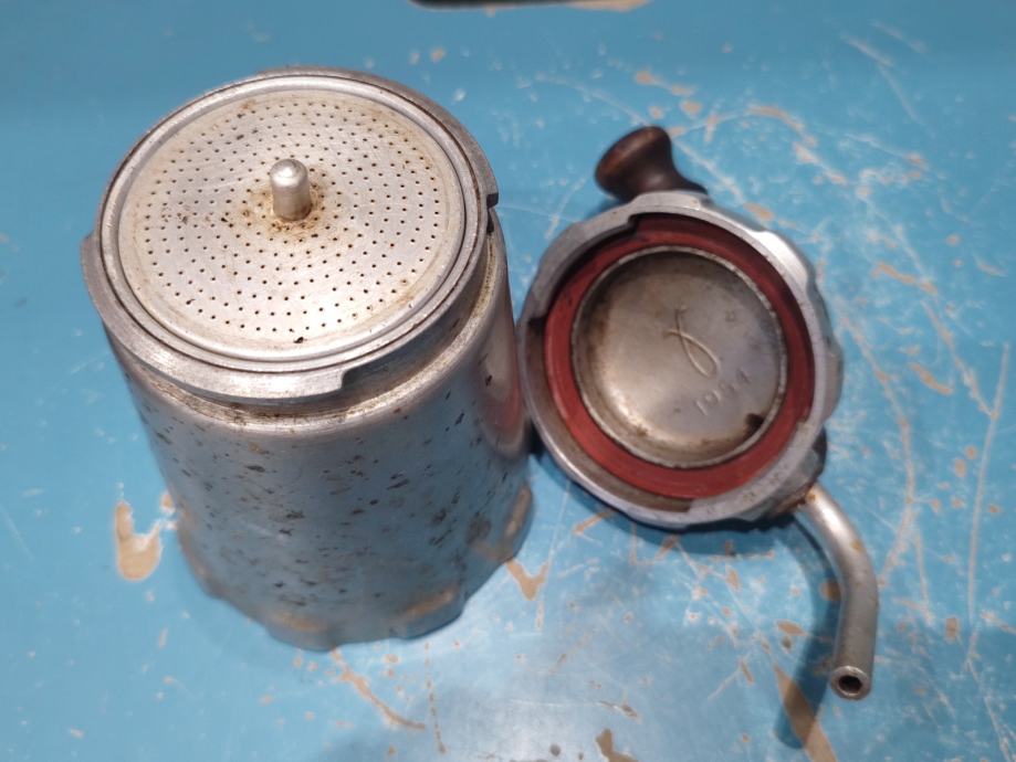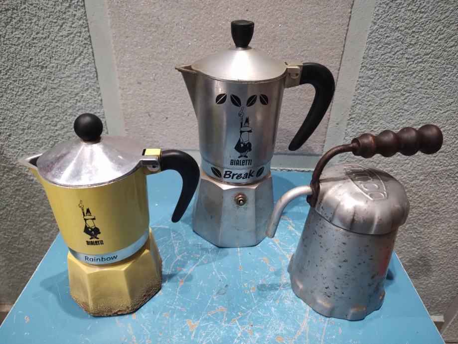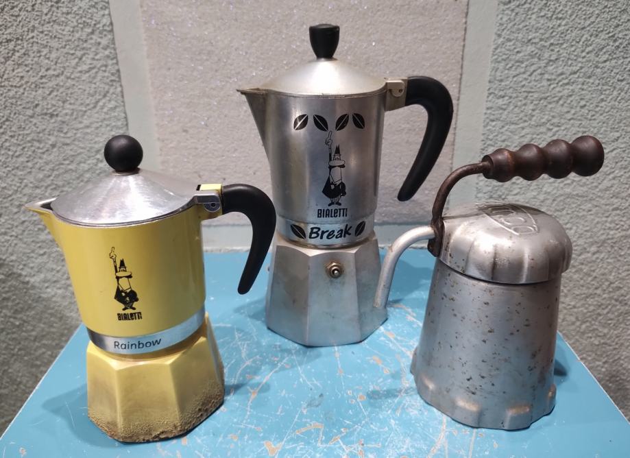 Tri uređaja za espresso kavu. Prvi je Gomba, mađarski retro aparat za kavu (espresso kuhalo) koji se proizvodio tijekom 1950-ih i 1960-ih godina. Naziv "Gomba" na mađarskom jeziku znači "gljiva", što se odnosi na specifičan oblik gornjeg dijela uređaja. Dizajniran je u Mađarskoj kao varijacija popularnih talijanskih Bialetti Moka aparata. Često se naziva i "Margo Bomba" ili "Autopress".0Materijal: Izrađen je od aluminija, s karakterističnom drvenom ili plastičnom ručkom na vrhu za sigurno rukovanje.Način rada: Funkcionira na sličnom principu kao Moka posuda, ali s cjevčicom (izljevom) kroz koju kava izlazi izravno u šalicu. I 2 aparata za espresso Bialetti.Prepoznatljivi su po logotipu "L'Omino con i baffi" (čovječuljak s brkovima) i ukrasnim listićima kave na gornjem dijelu.