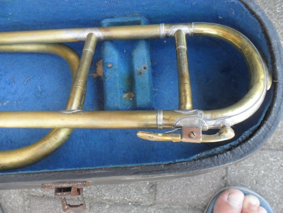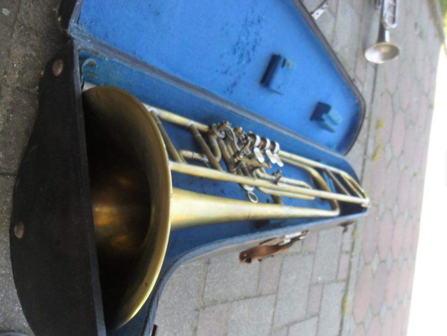 dosta sačuvan i star,kompletan sa koferom,,još svira,prekrasan za dekoraciju na zidu..ukupna dužina sastavljenog je115cm..širina 43cm, imam još dosta puhačkih instrumenata(i još jedan sličan ali malo krači trombon) koje možete vidjeti na slikama a opširnije na mojim ostalim oglasima............................