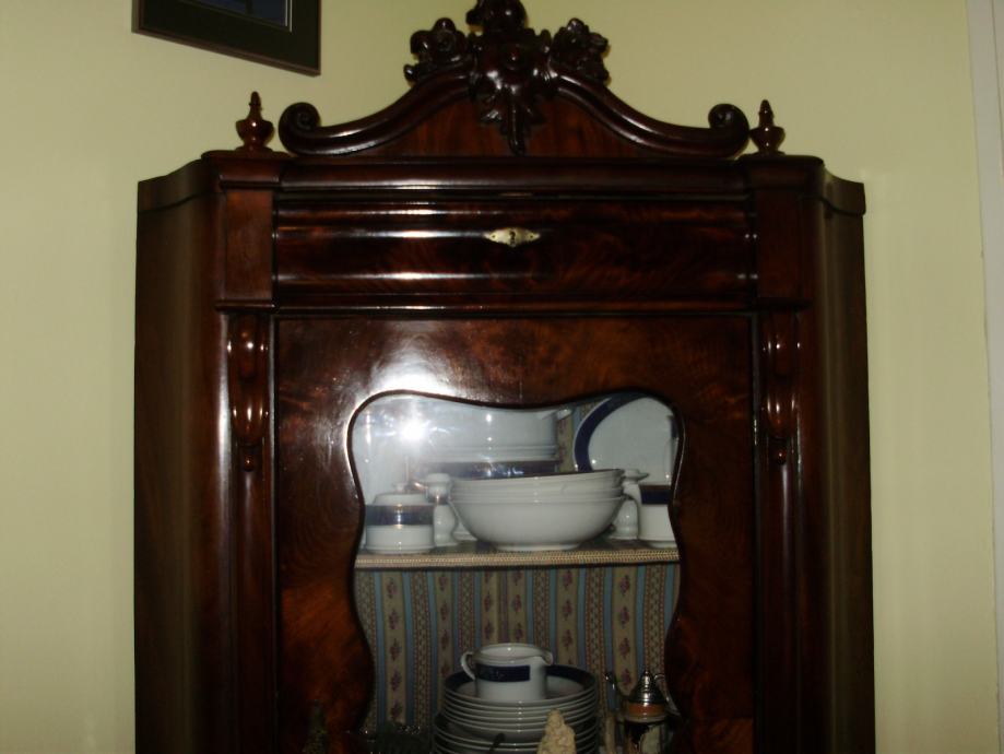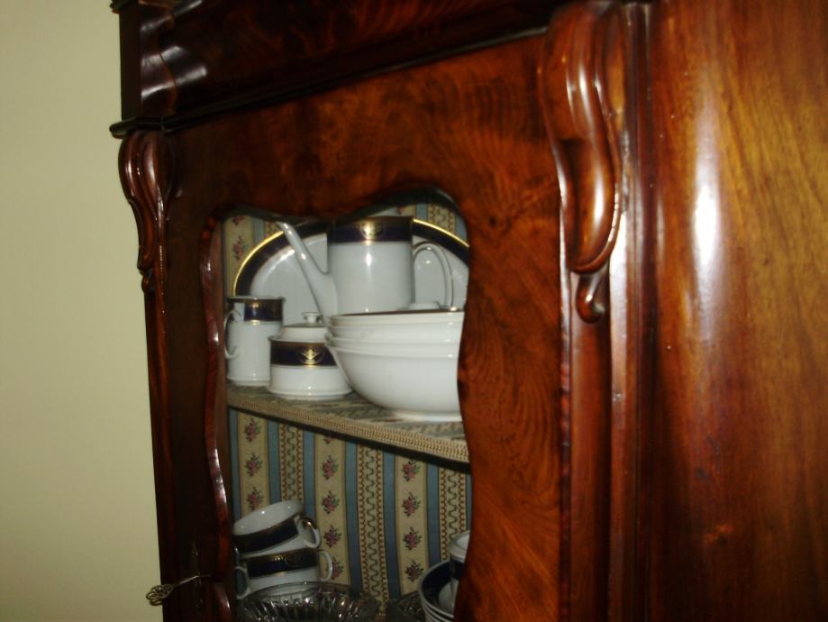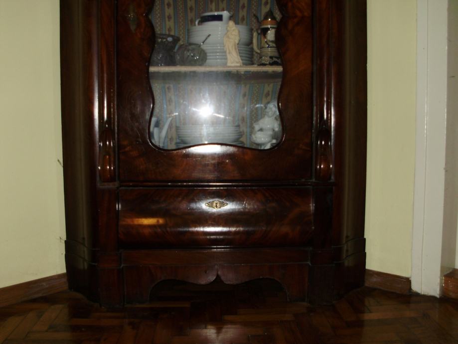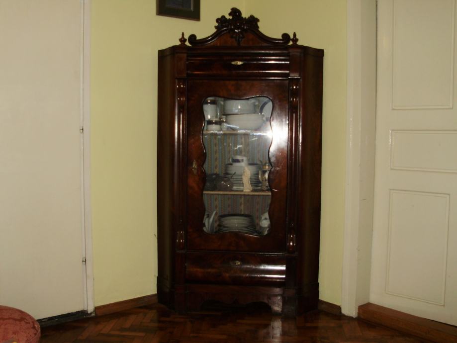 Stara ugaona vitrina iz vremena sa tapecirungom iznutra stanje vrhunsko muzejski primjerak ,obiteljsko nasljeđe.