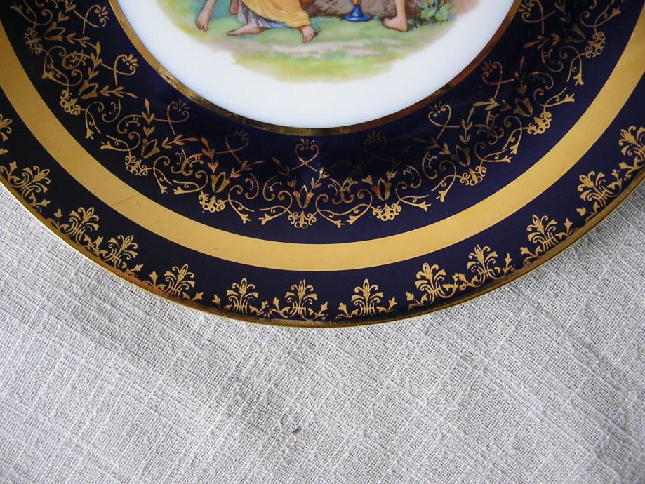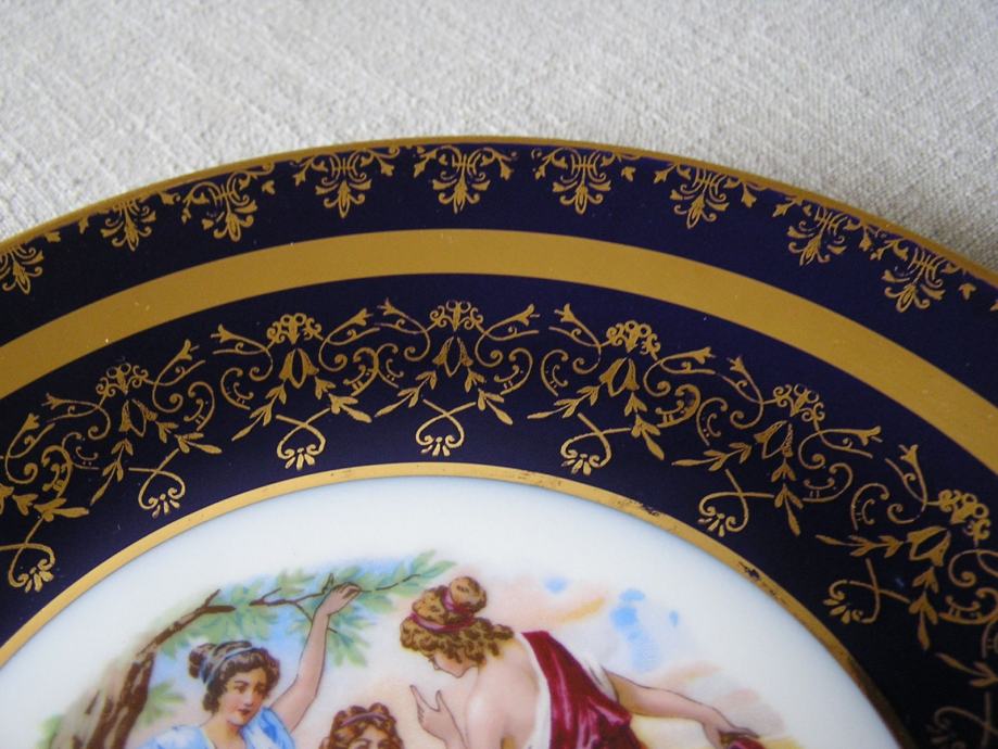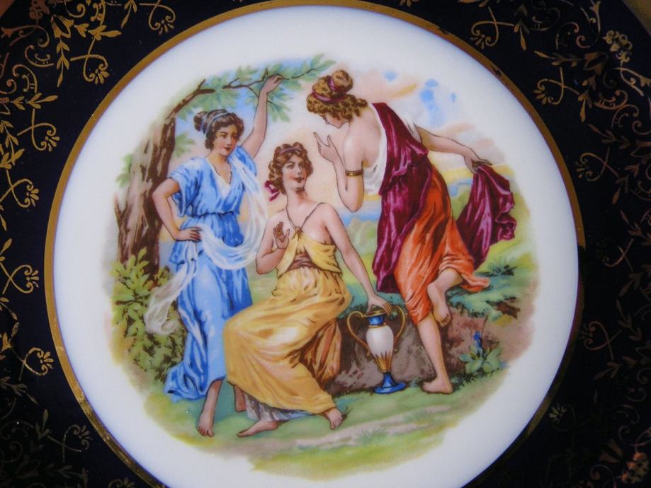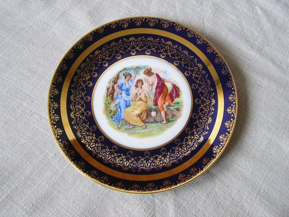 Ukrasni tanjur u kobalt plavoj boji sa puno pozlate, zlatnih ornamenata i sa središnjom slikom rimskih božica poznatih kao "Tri Gracije". Čehoslovački porculan, Moritz Zdekauer sa žigom koji se koristio u periodu 1947. - 1992. Tanjur je bez oštećenja. Ljepši je u naravi nego na slikama jer na slikama ima dosta odsjaja koji izgledaju kao tamne mrlje.Tanjur nema alku za vješanje na zid, no tko želi može je staviti.
