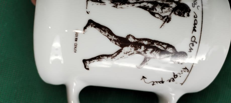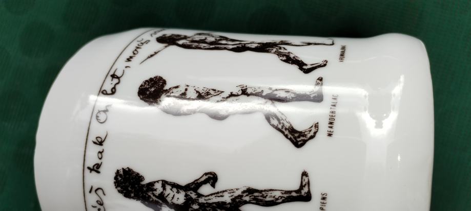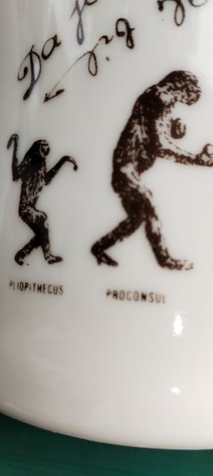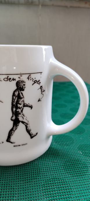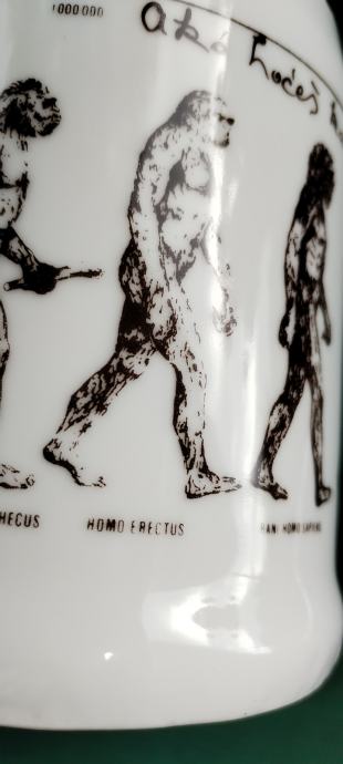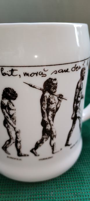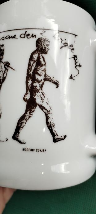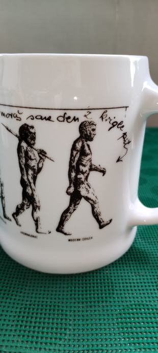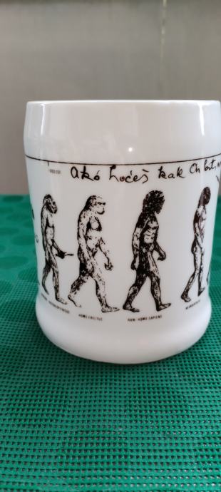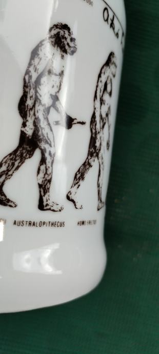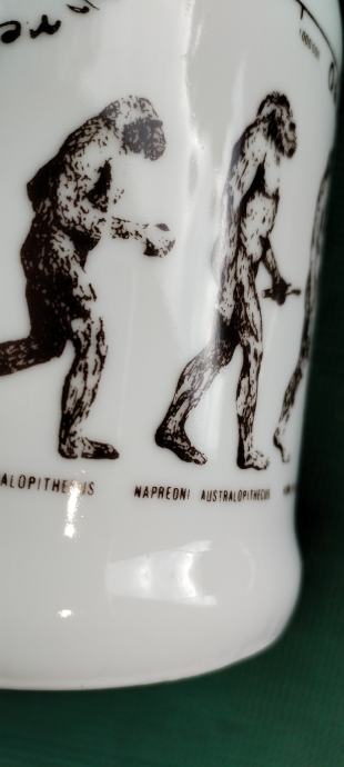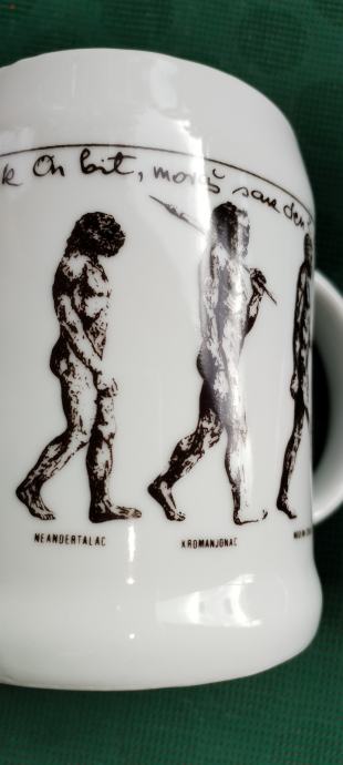 Prodajem keramičku kriglu sa vrlo interesantnim tekstom i slikama evolucije čovjeka od pliopithecusa. Tekst glasi ovako: Da je predak vinček pil, nebi ovak mali bil. Ako hoćeš kak on biti, moraš sak den z krigle piti. Zapremina je cca 6dcl.