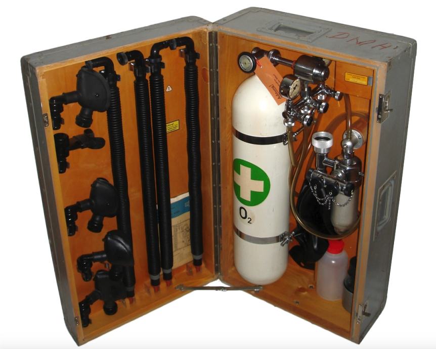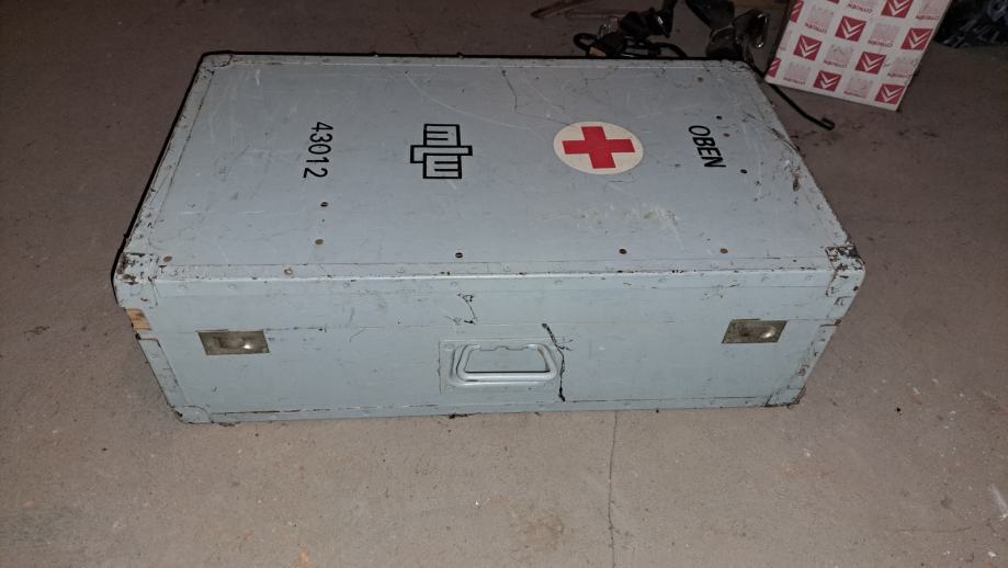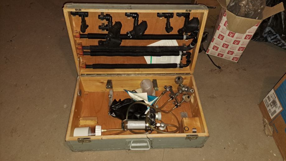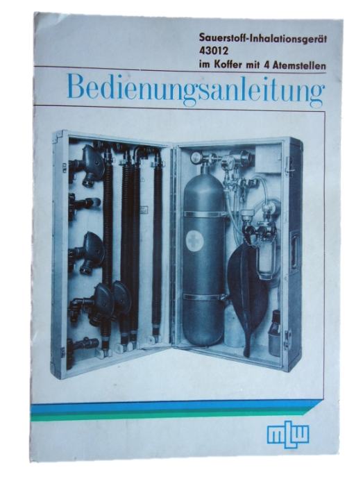 Prodaje se uređaj za inhalaciju kisika, proizveden u DDR-u "Medi MLW 43012", koji se proizvodio od 1967. - 1989. godine. Opslužuje istovremeno 4 osobe. Nedostaje boca s kisikom i dio gumenih dijelova treba zamijeniti. Zapakirano u originalnu, drvenu kutiju. Uređaj nije nikad korišten. U prilogu je i fotografija uređaja s bocom za kisik, zbog usporedbe.
