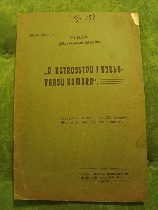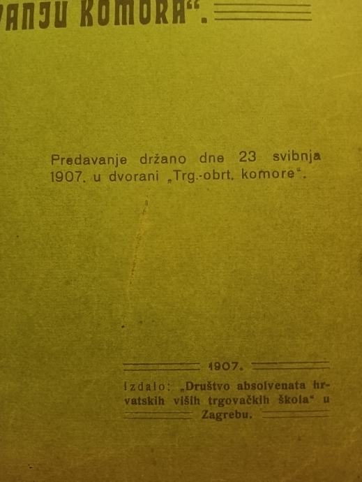 Prodajem knjižicu na 20 stranica, o ustrojstvu i djelovanju komora ( predavanje održano dne 23 svibnja 1907 u dvorani trg.obrt. komore), prilog Hrvatskom Lloydu. Plačanje na račun ili gotovina.