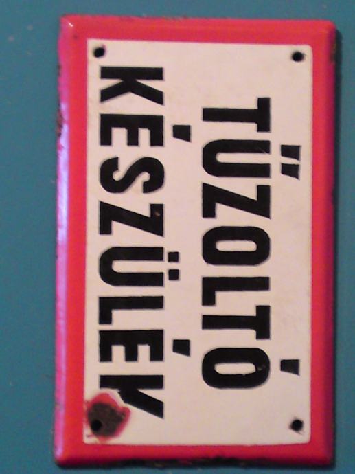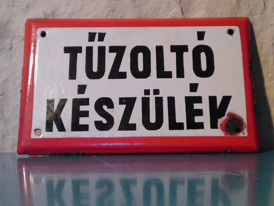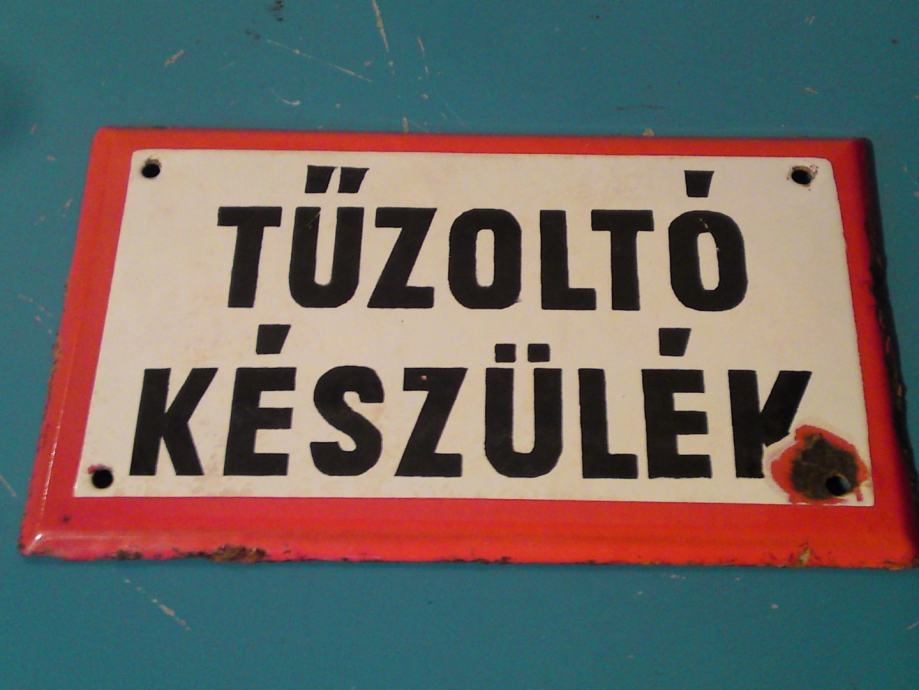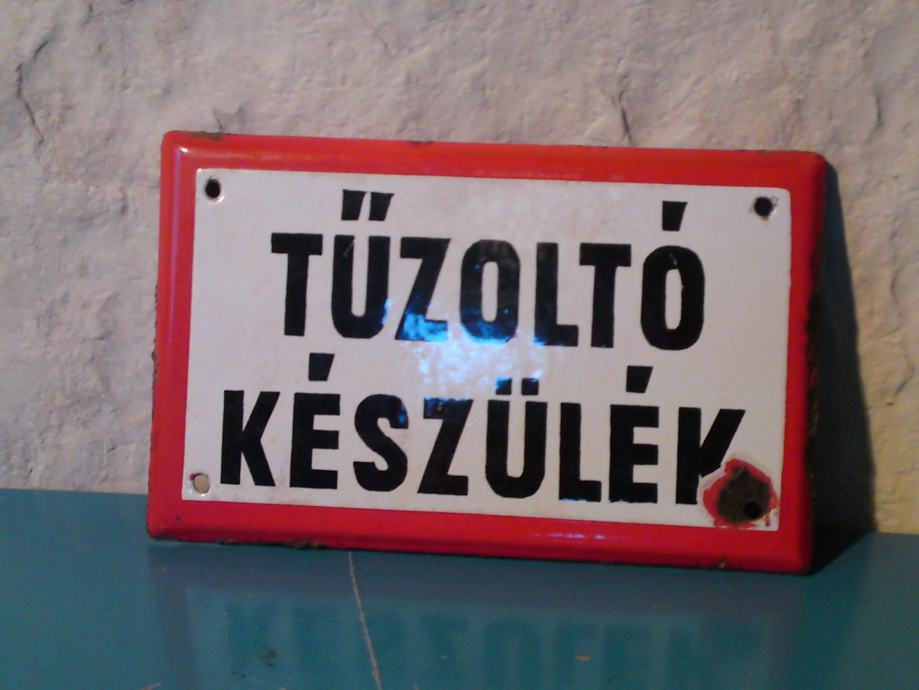 Stara mađarska emajlirana tabla sa natpisom: vatrogasni aparat, na mađarskom jeziku; stanje: dobro, sačuvano; podrijetlo: Baranja, iz perioda pod mađarskom okupacijom.